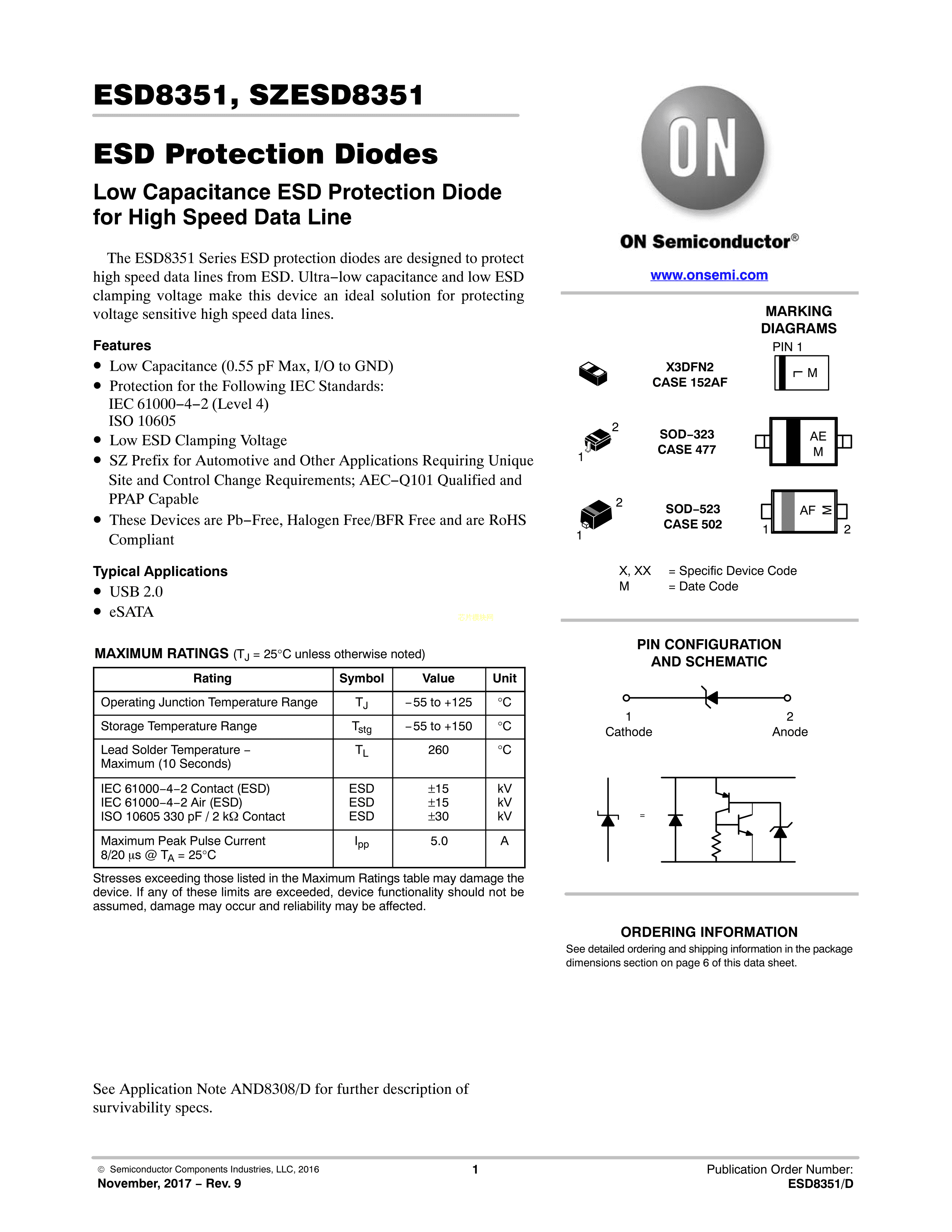 ESD8351XV2T1G数据手册SOD-523封装onsemi(安森美)PDF规格书,中英文下载