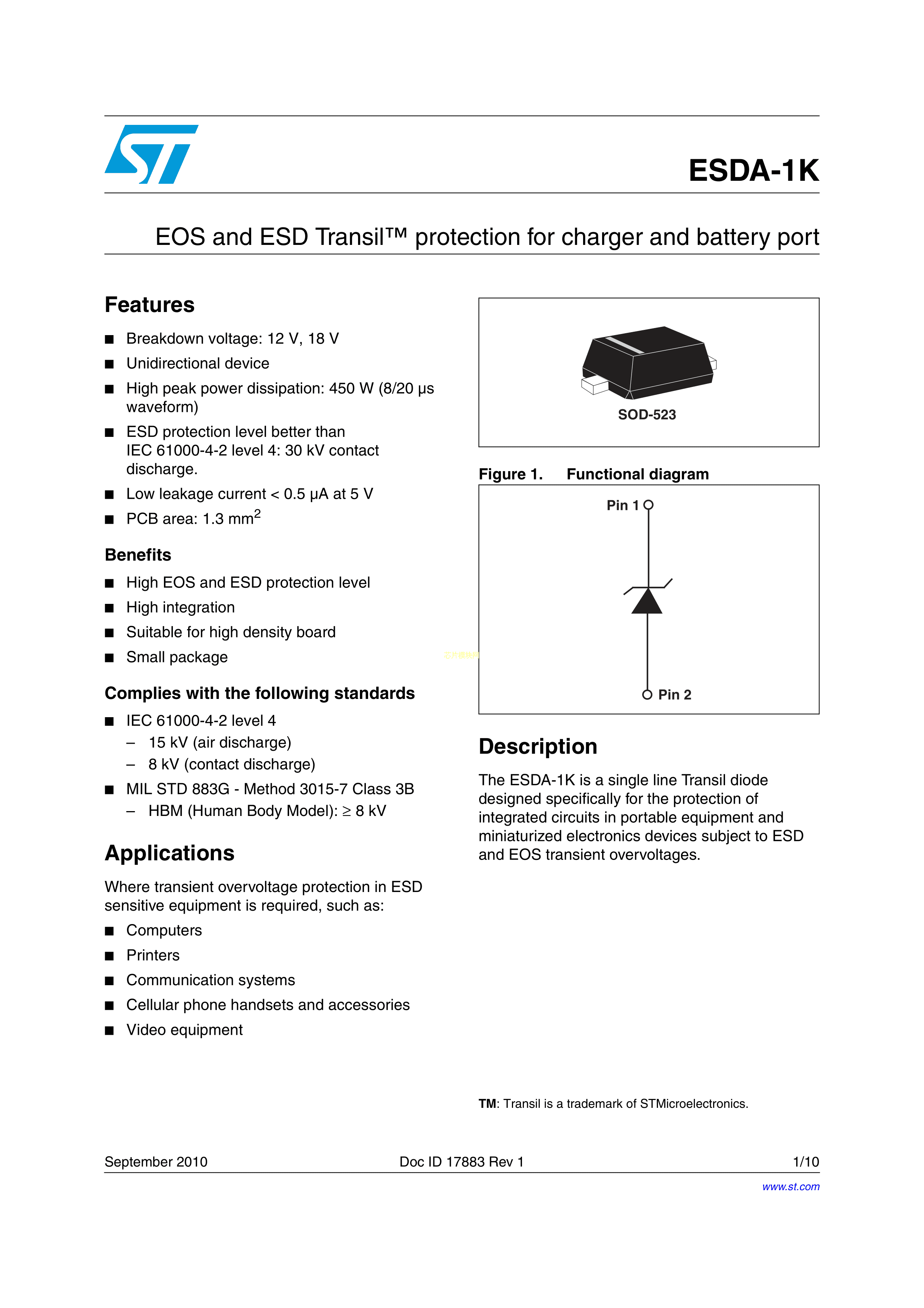 ESDA12-1K数据手册SOD-523封装ST(意法半导体)PDF规格书,中英文下载