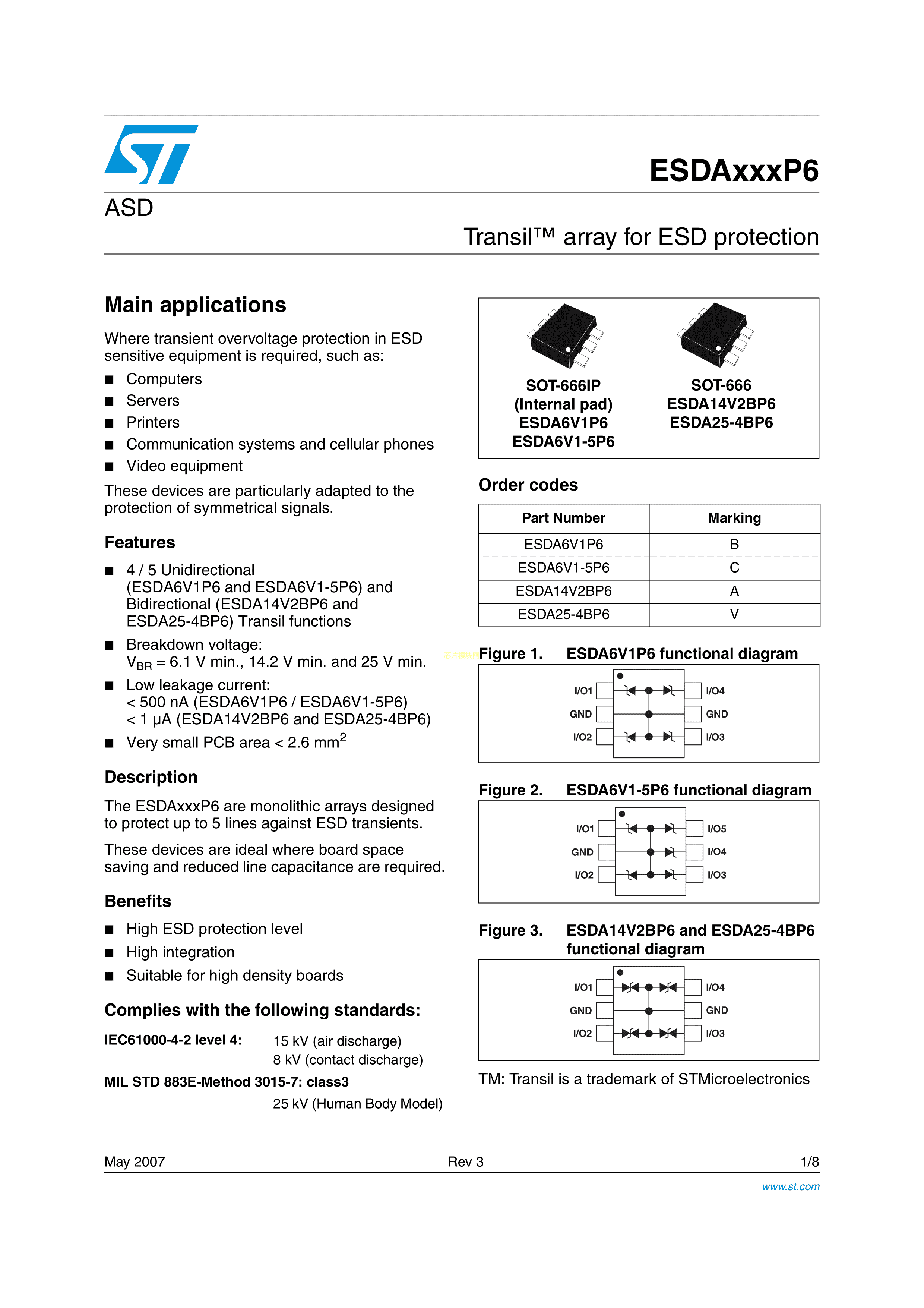 ESDA6V1P6数据手册SOT-666IP封装ST(意法半导体)PDF规格书,中英文下载