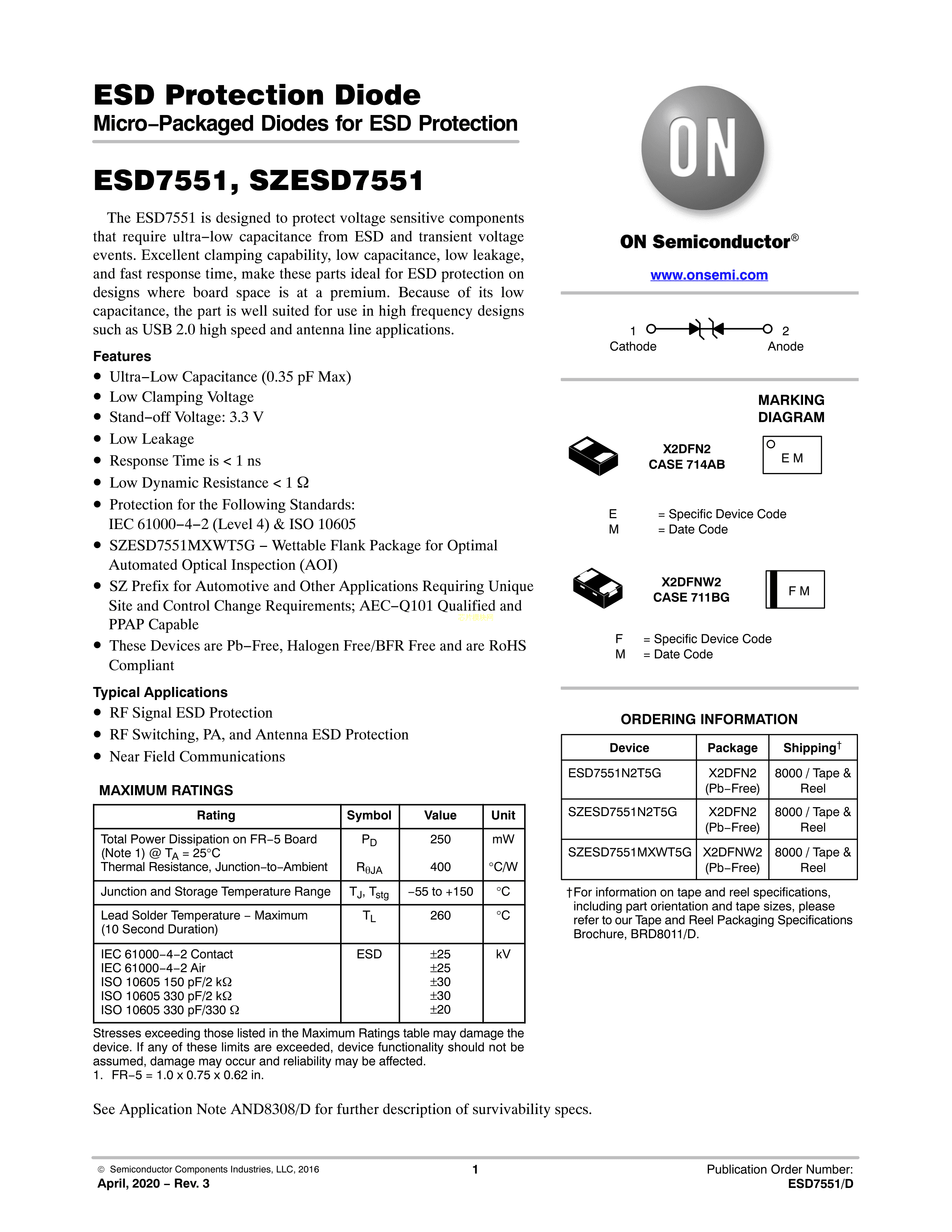 ESD7551N2T5G数据手册X2DFN-2封装onsemi(安森美)PDF规格书,中英文下载