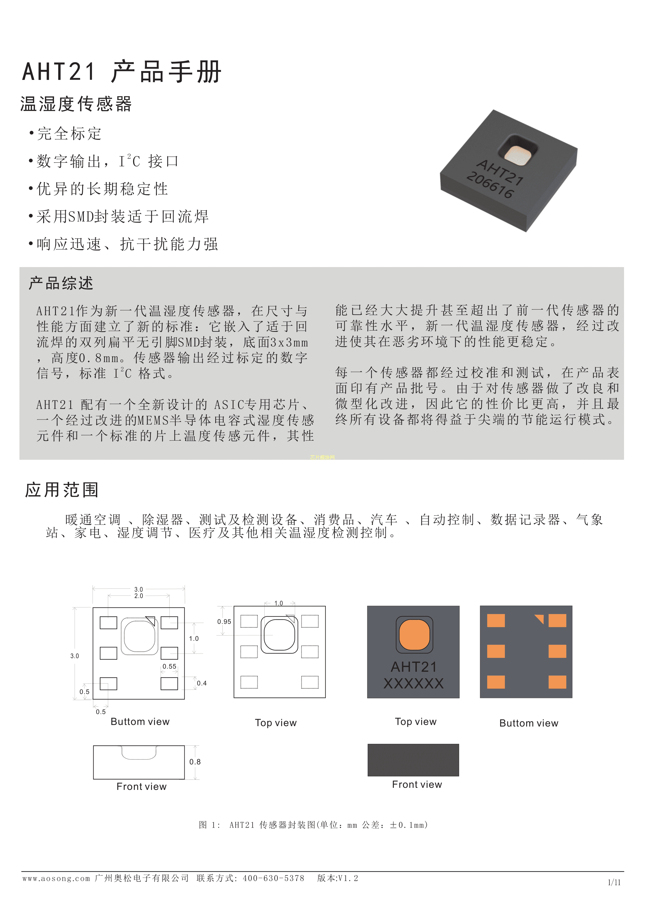 AM2302数据手册25.3mmx15.4mmx7.8mm封装广州奥松PDF规格书,中英文下载