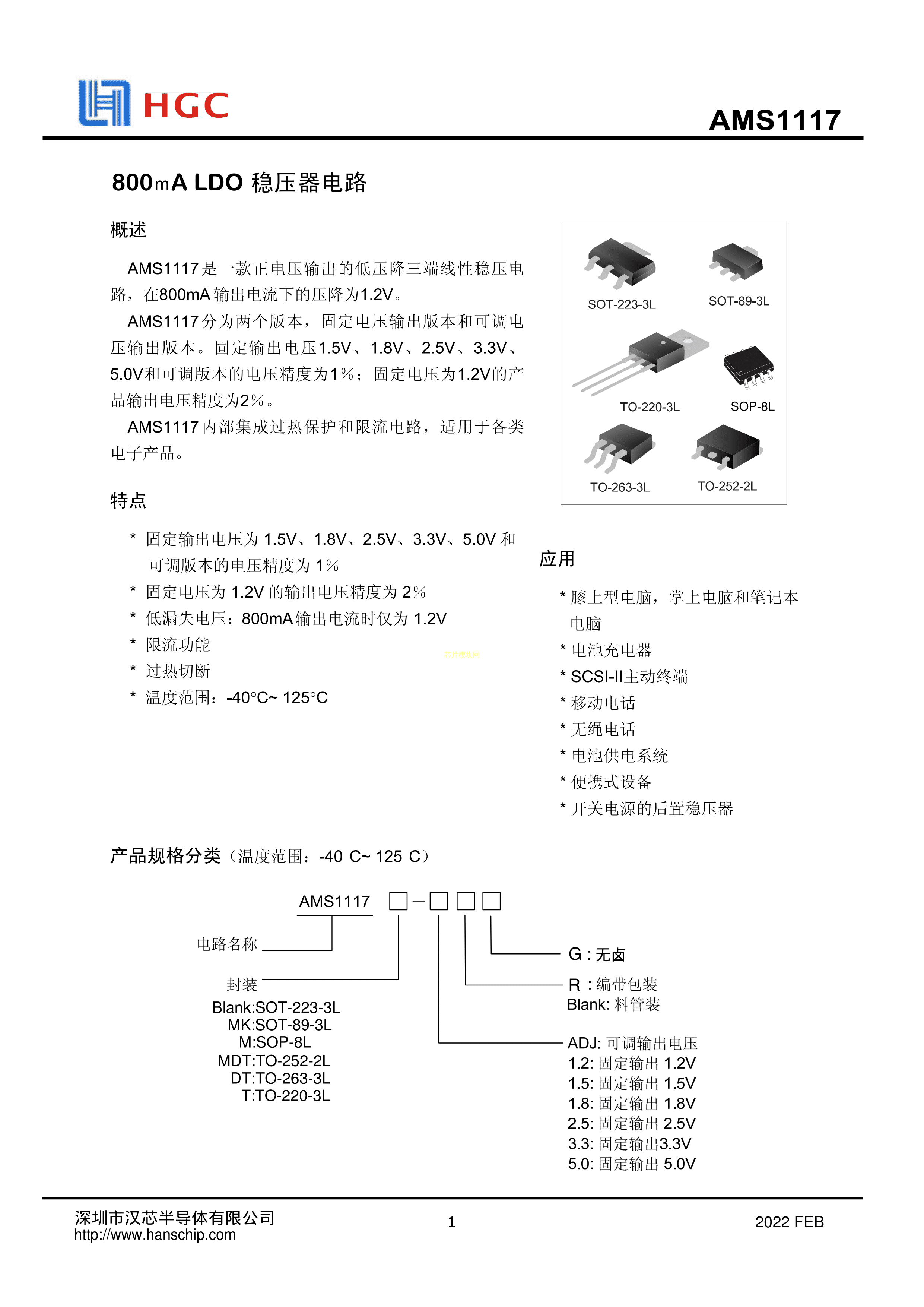 AMS1117-1.8RG数据手册SOT-223-3L封装HGC(深圳汉芯)PDF规格书,中英文下载