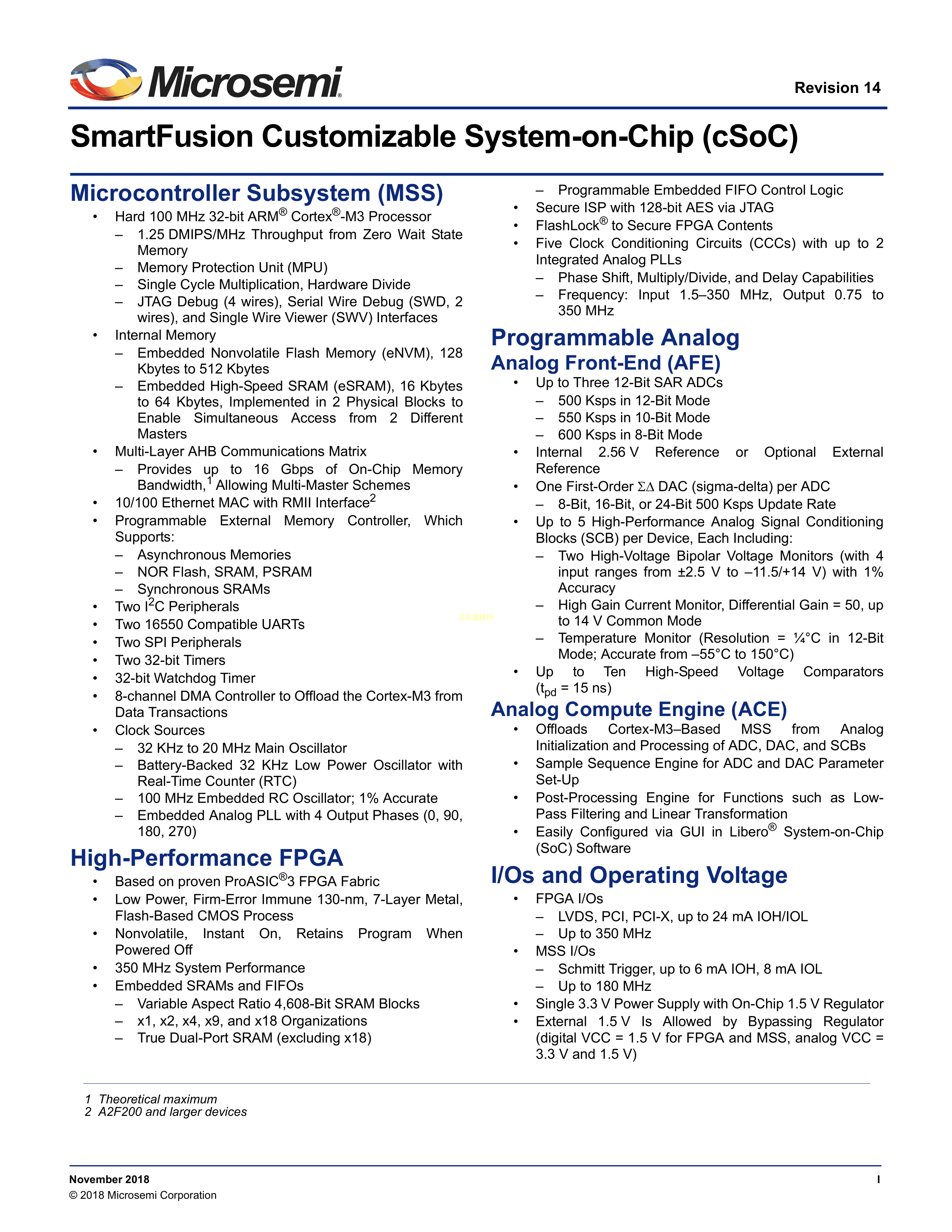 A2F500M3G-FG256数据手册FPBGA-256(17x17)封装Microsemi(美高森美)PDF规格书,中英文下载
