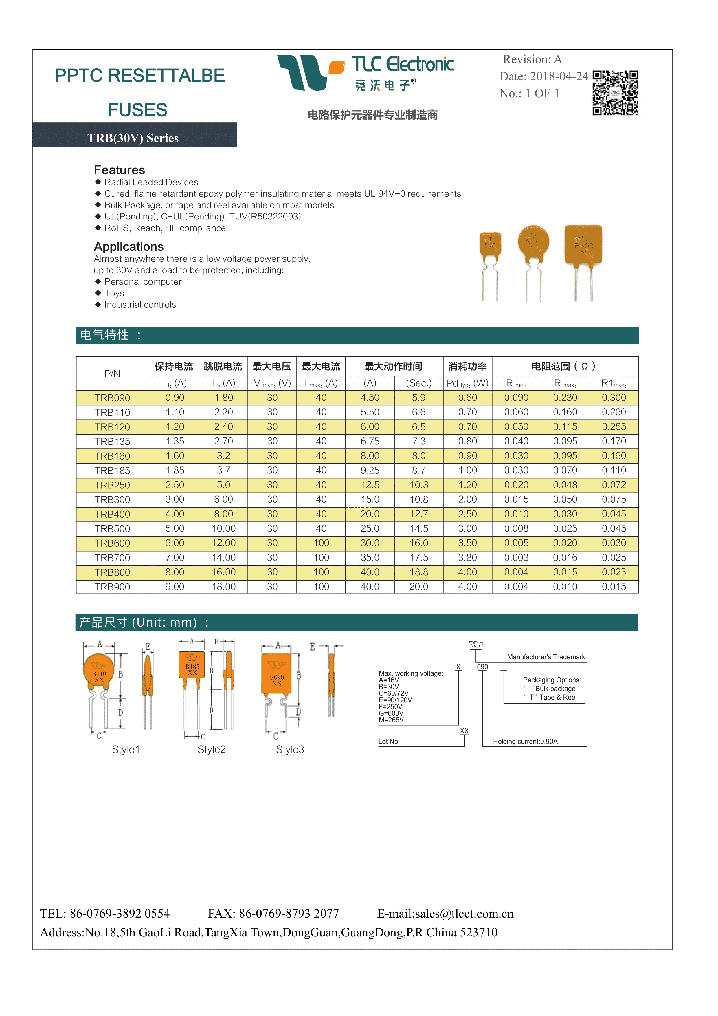 TRC030数据手册径向引线P5.1mm封装TLC(竞沃)PDF规格书,中英文下载