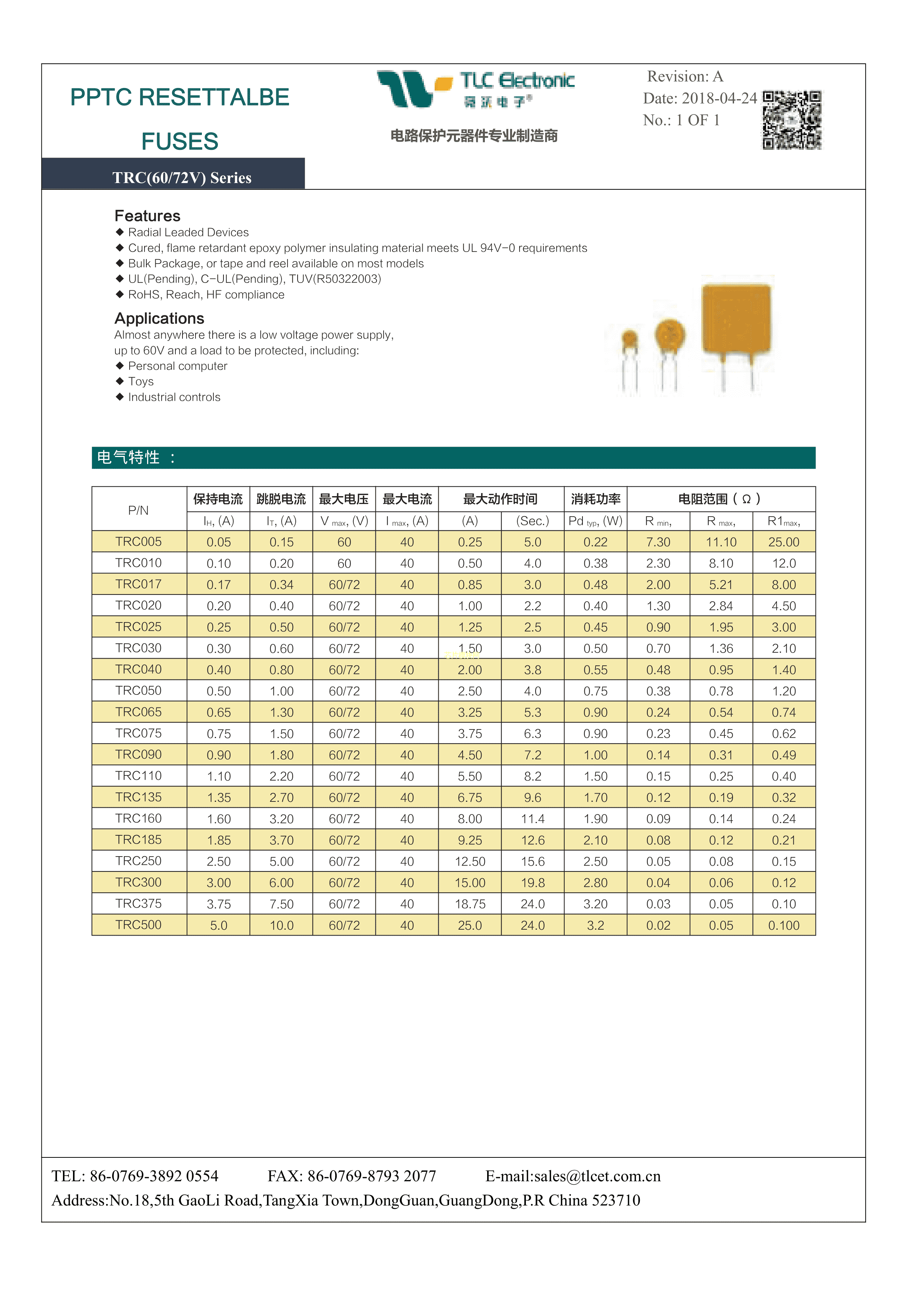 TRC050数据手册径向引线P5.1mm封装TLC(竞沃)PDF规格书,中英文下载