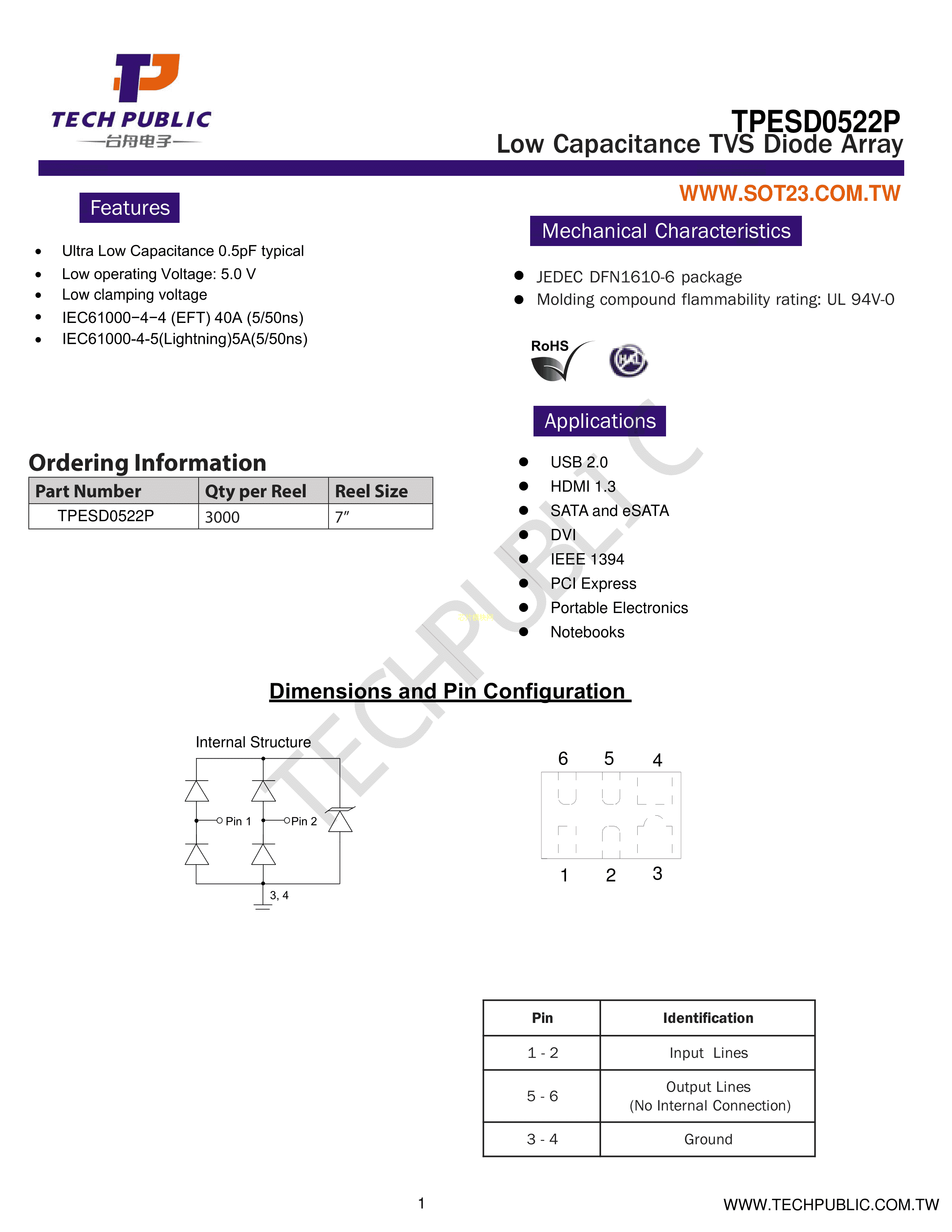 TPESD0522P数据手册DFN1610-6封装TECHPUBLIC(台舟)PDF规格书,中英文下载