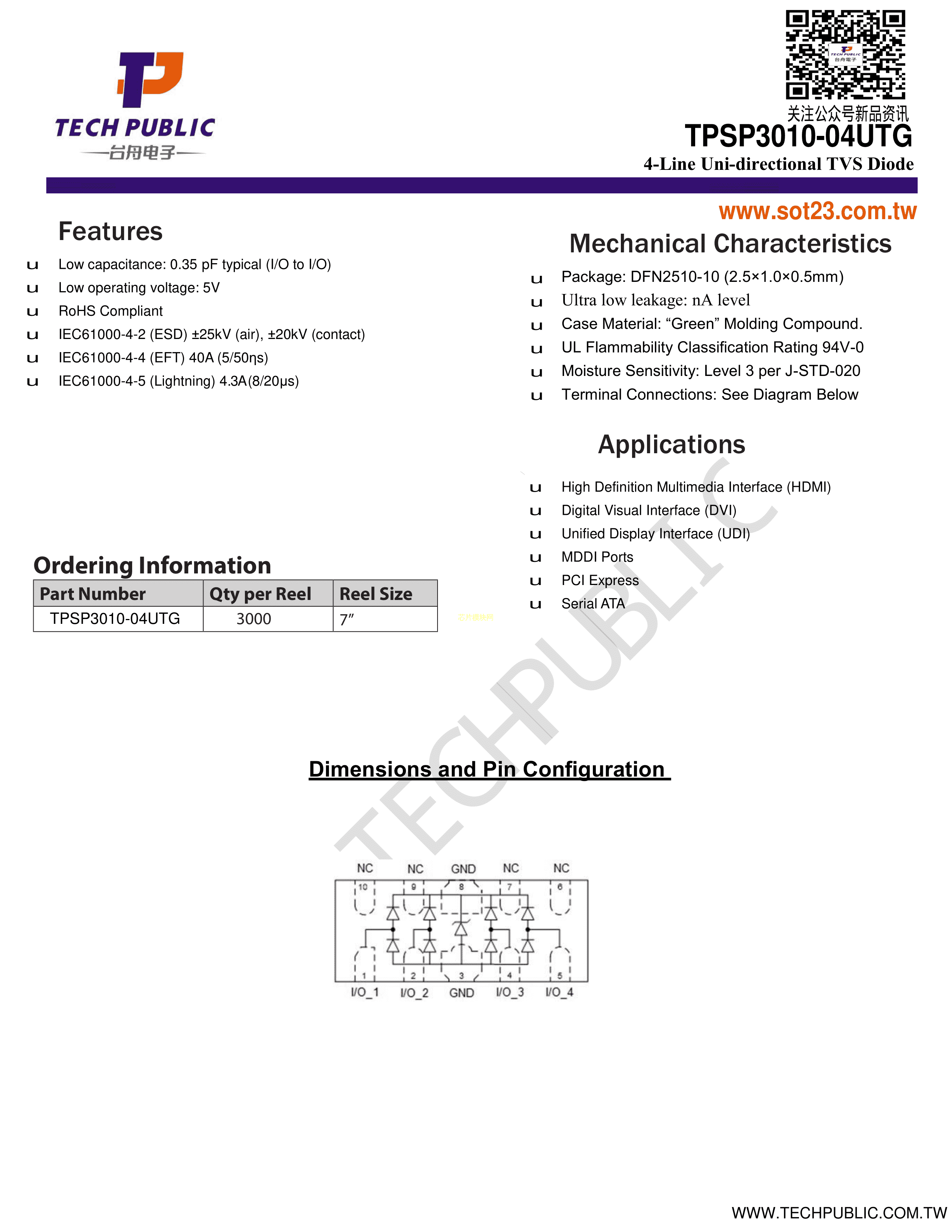 TPSP3010-04UTG数据手册DFN2510-10封装TECHPUBLIC(台舟)PDF规格书,中英文下载