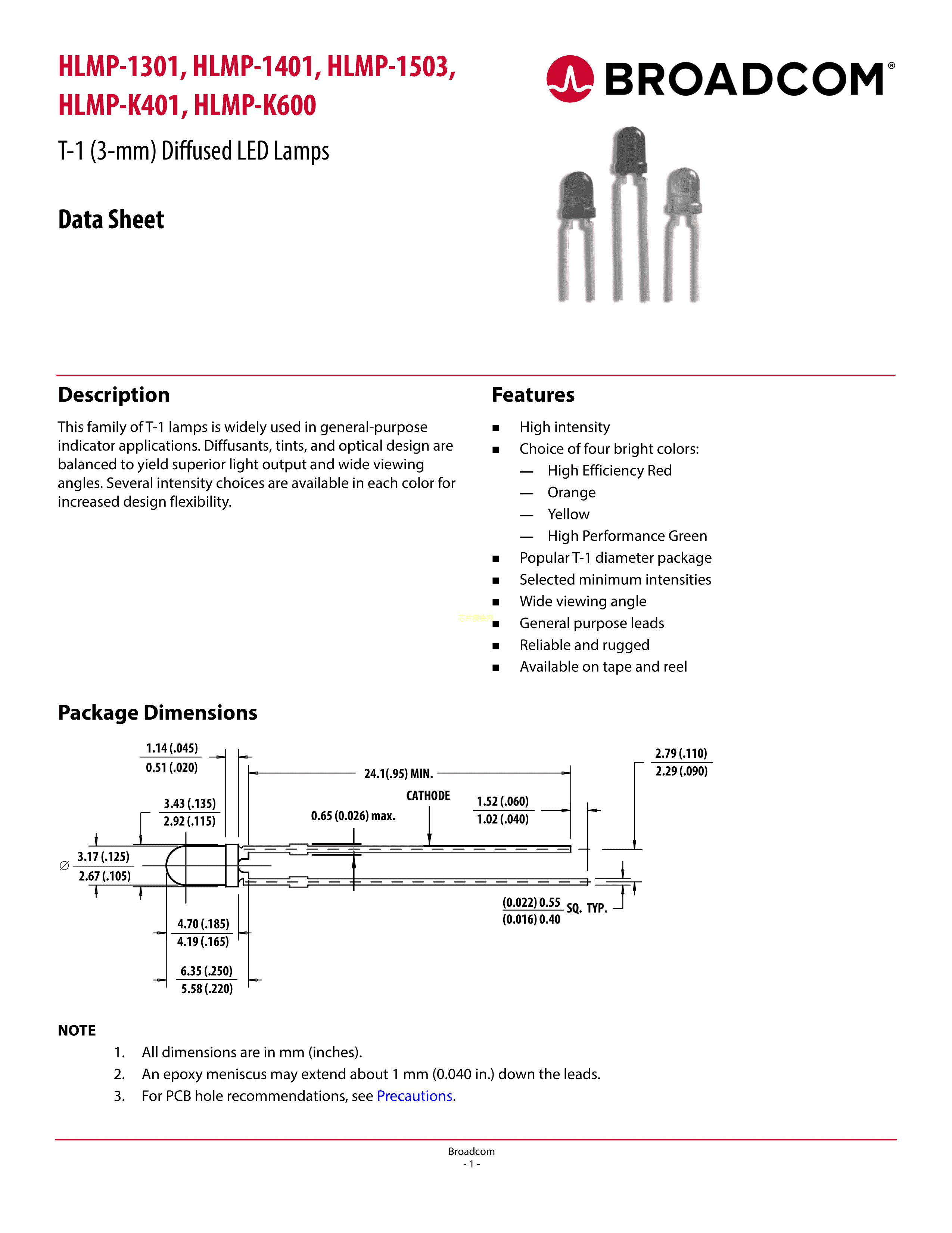 HLMP-1503数据手册插件φ3mm封装Broadcom(博通)PDF规格书,中英文下载
