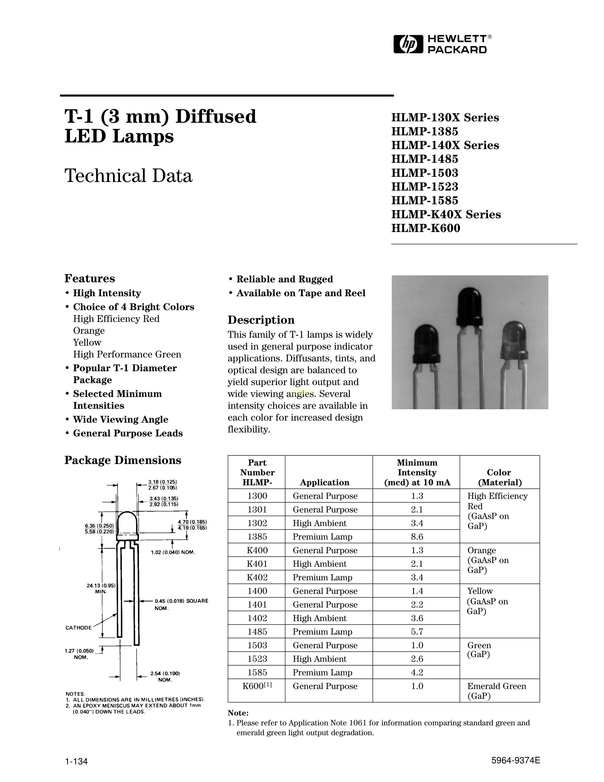 HLMP-1401数据手册插件φ3.18mm封装AVAGO(安华高)PDF规格书,中英文下载
