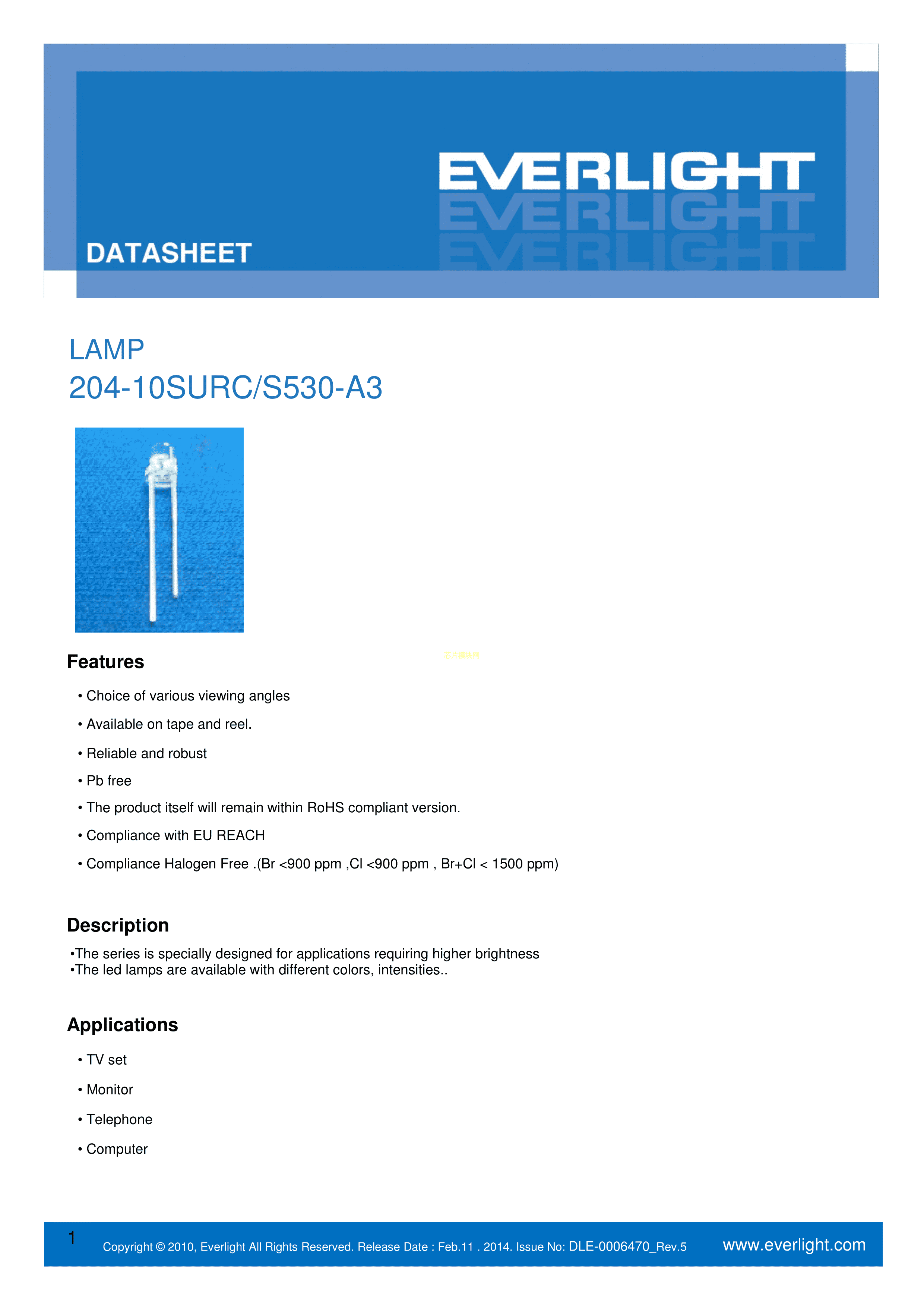 204-10SURC-S530-A3数据手册插件φ3mm封装EVERLIGHT(台湾亿光)PDF规格书,中英文下载