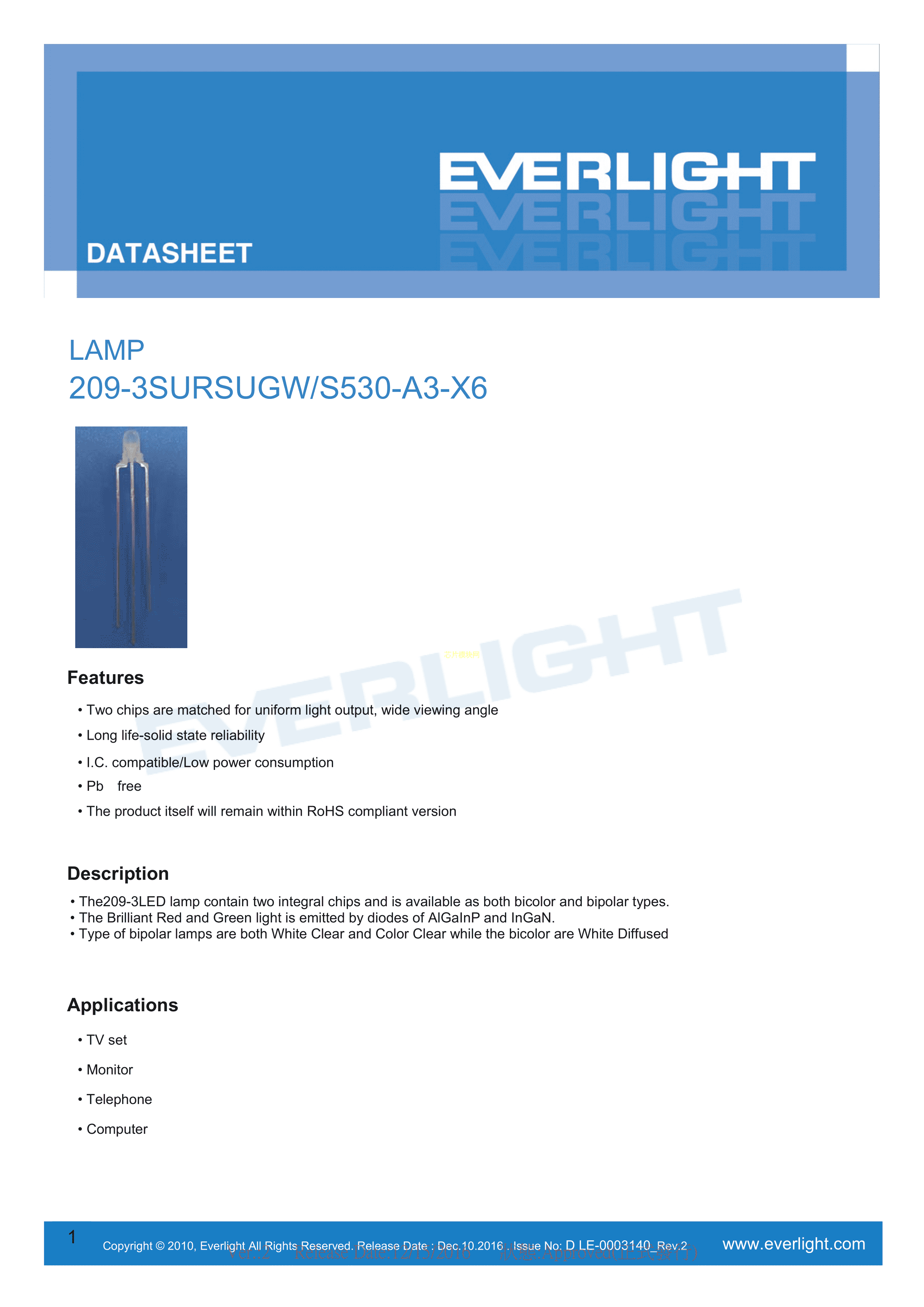 209-3SURSUGW-S530-A3-X6数据手册插件φ3mm封装EVERLIGHT(台湾亿光)PDF规格书,中英文下载