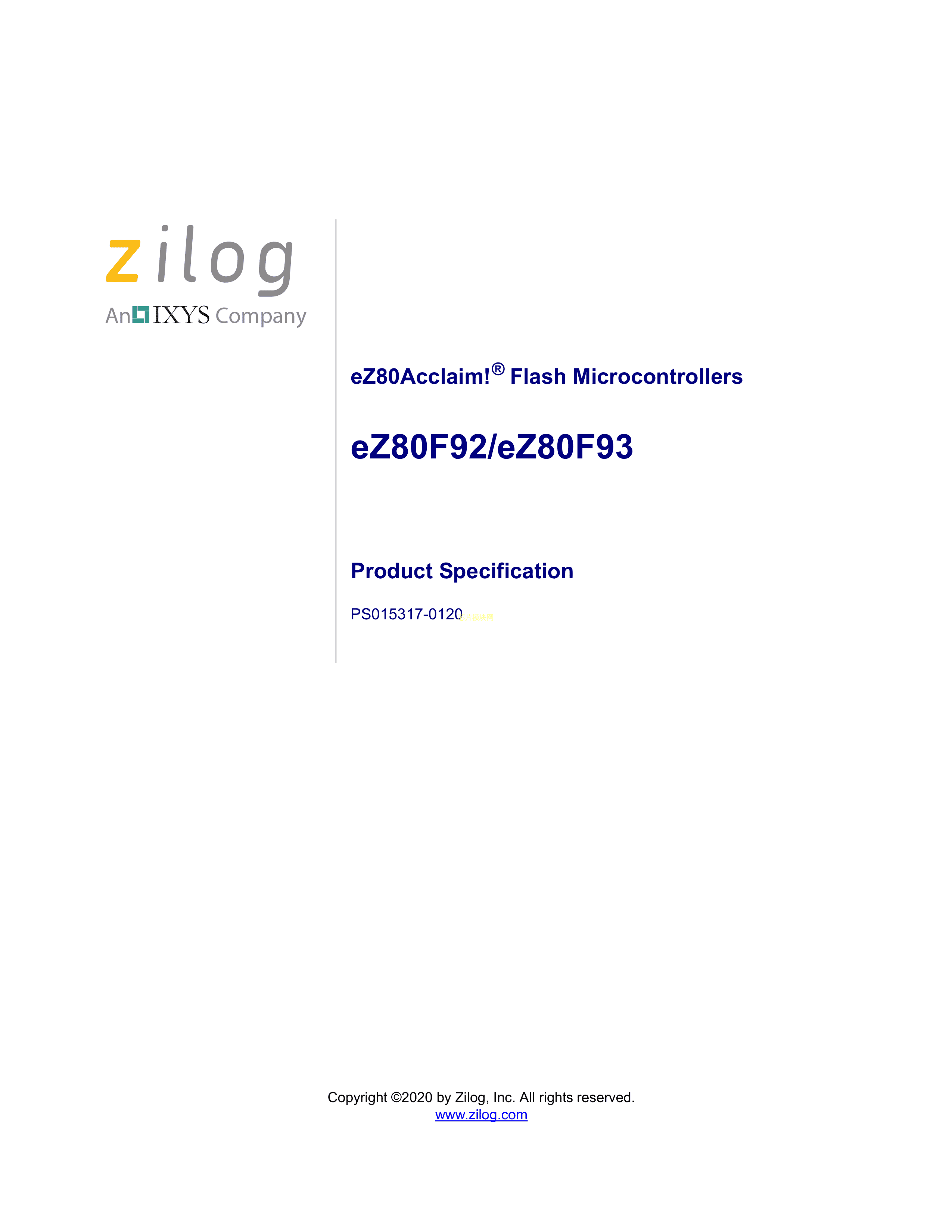 EZ80F93AZ020SG数据手册LQFP-100封装ZilogPDF规格书,中英文下载