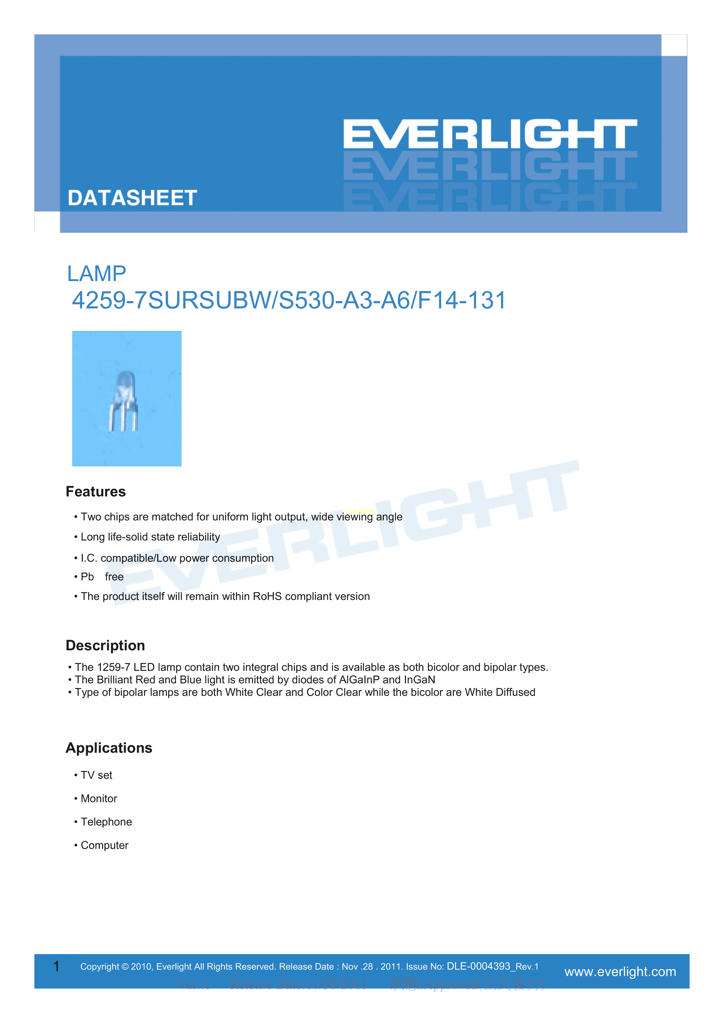 4259-7SURSUBW-S530-A3-A6-F14-131数据手册插件φ3mm封装EVERLIGHT(台湾亿光)PDF规格书,中英文下载