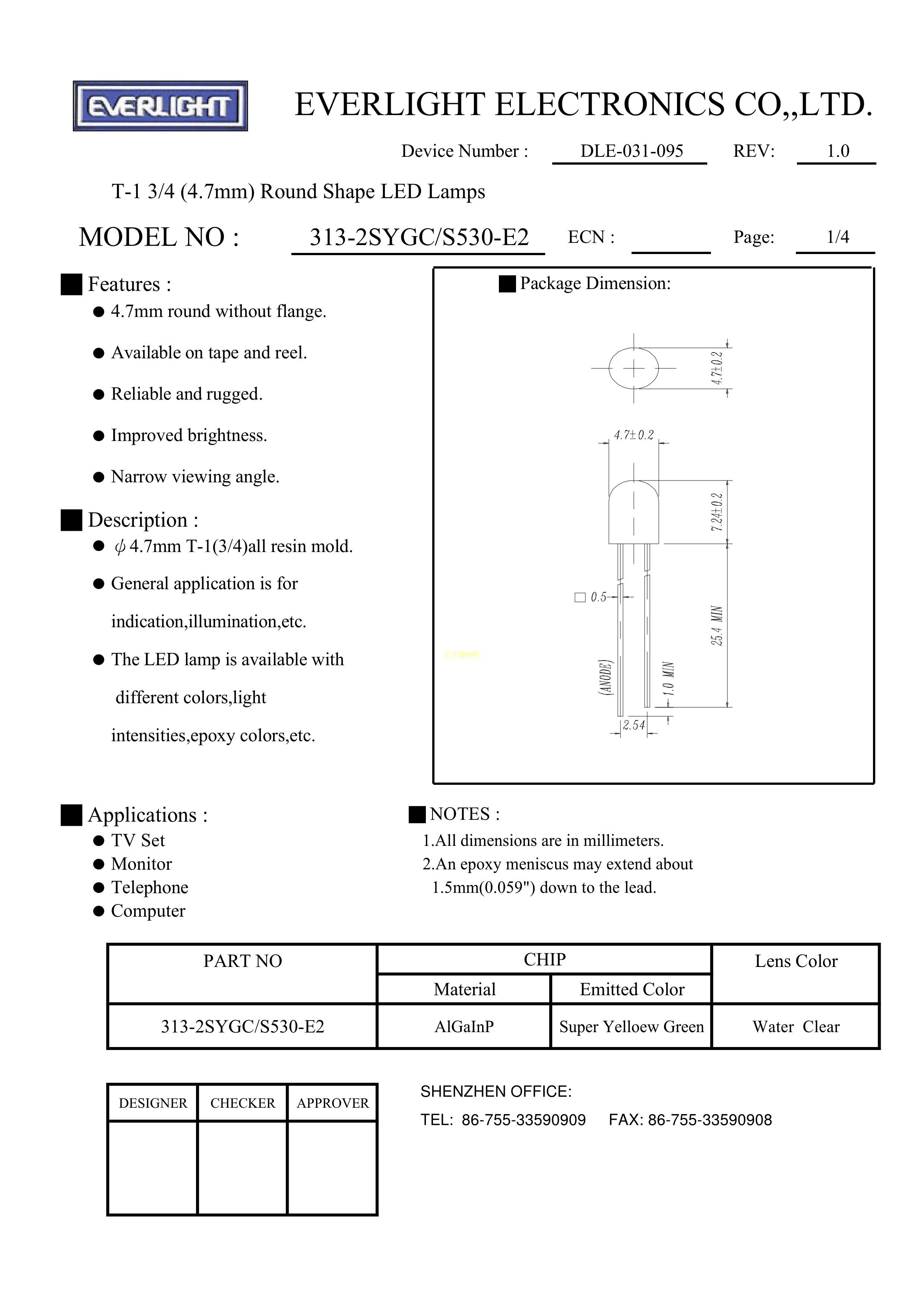 313-2SYGC-S530-E2数据手册插件φ4.7mm封装EVERLIGHT(台湾亿光)PDF规格书,中英文下载
