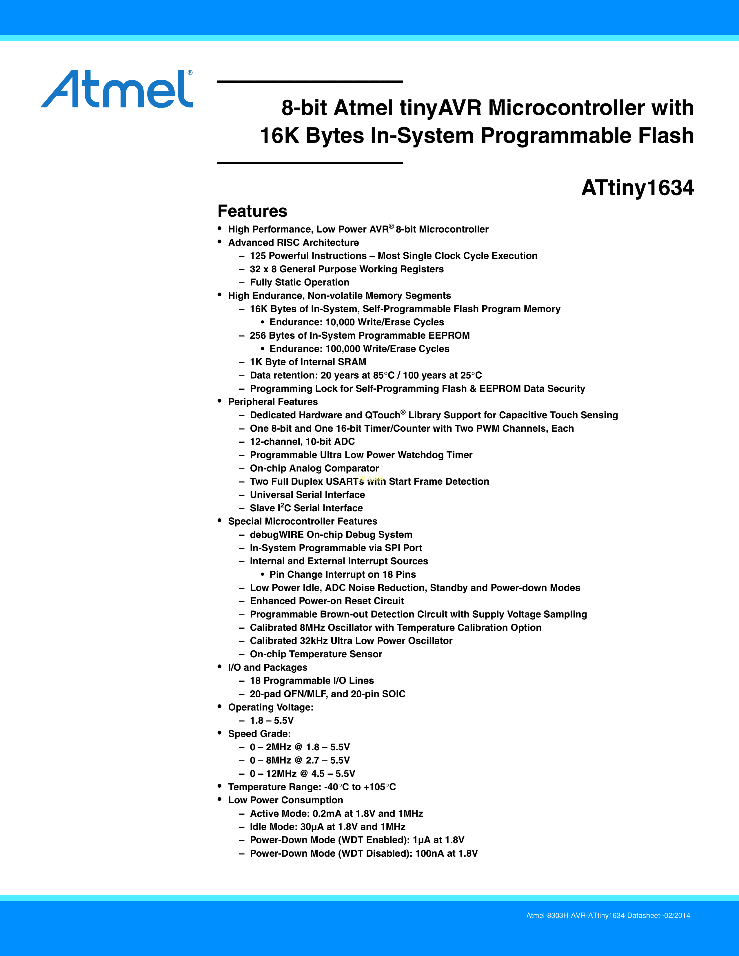 ATTINY1634R-MU数据手册QFN-20_4x4x05P封装MICROCHIP(美国微芯)PDF规格书,中英文下载