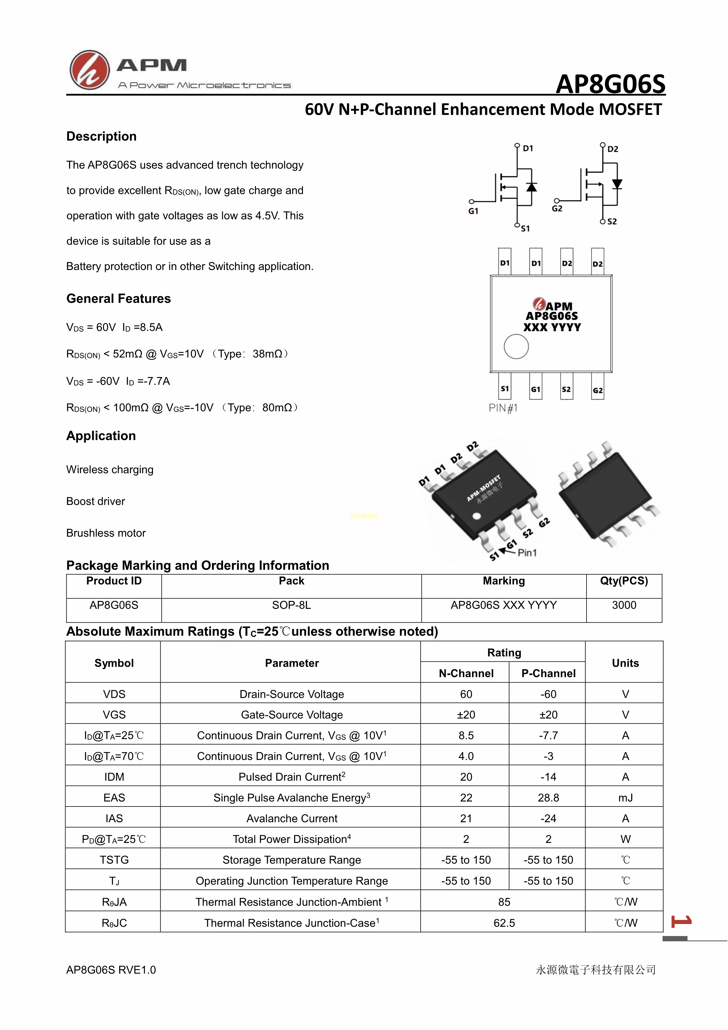 AP8G06S数据手册SOP-8封装APM(永源微电子)PDF规格书,中英文下载