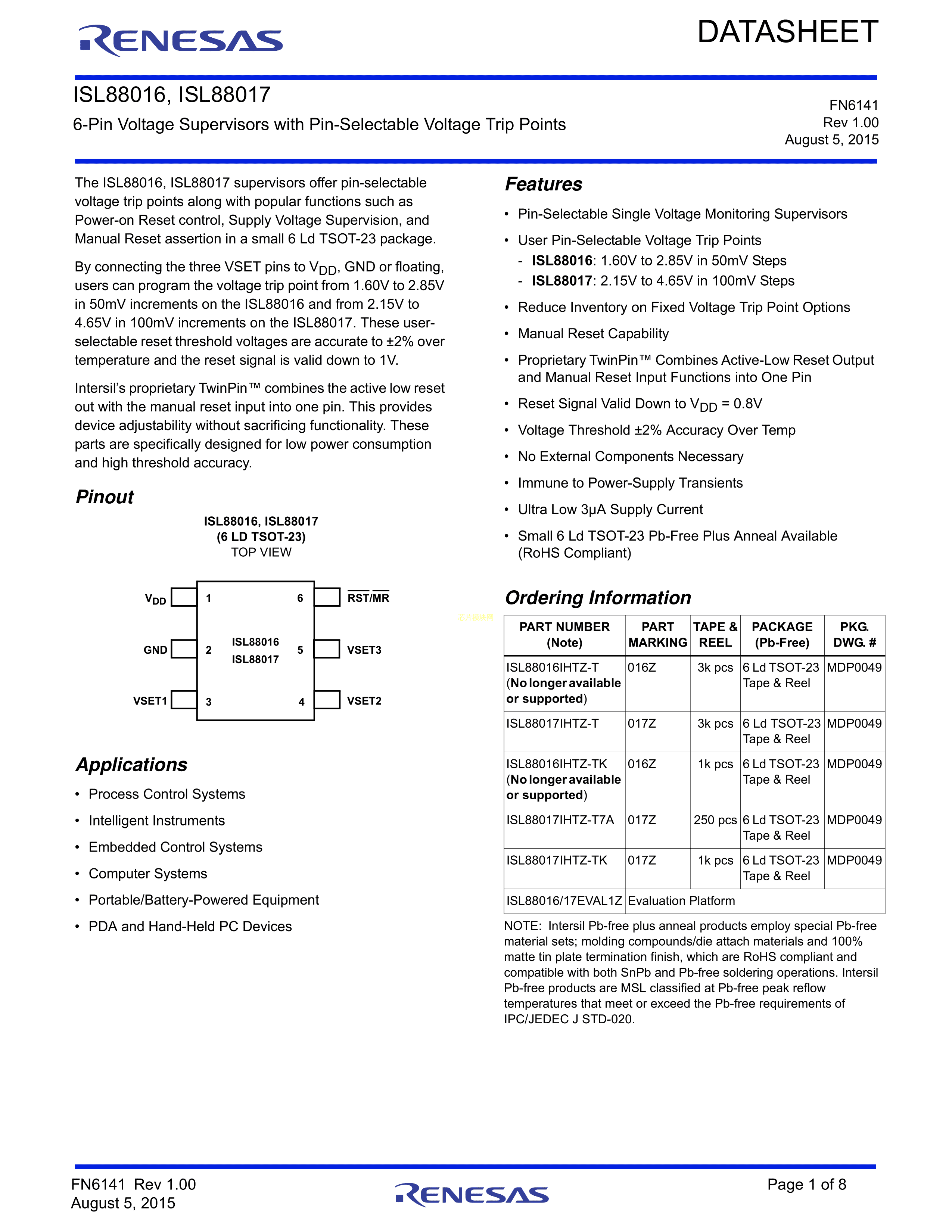 ISL88017IHTZ-T数据手册TSOT-23-6封装RENESAS(瑞萨)-IDTPDF规格书