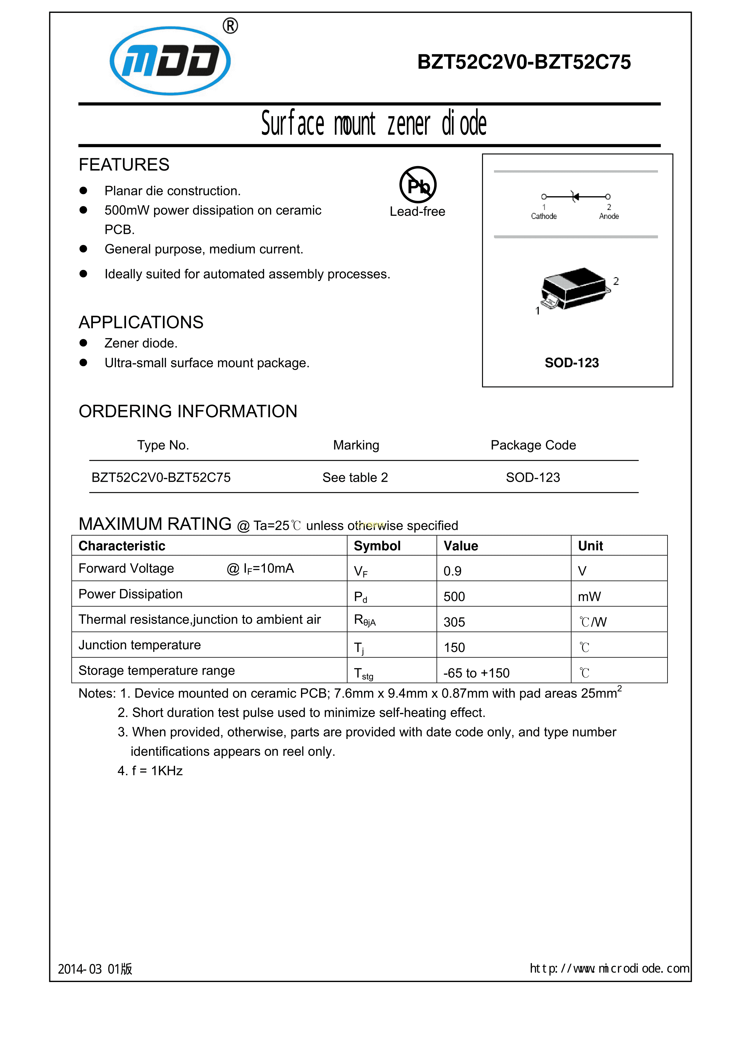 BZT52C12数据手册SOD-123封装MDDPDF规格书,中英文下载