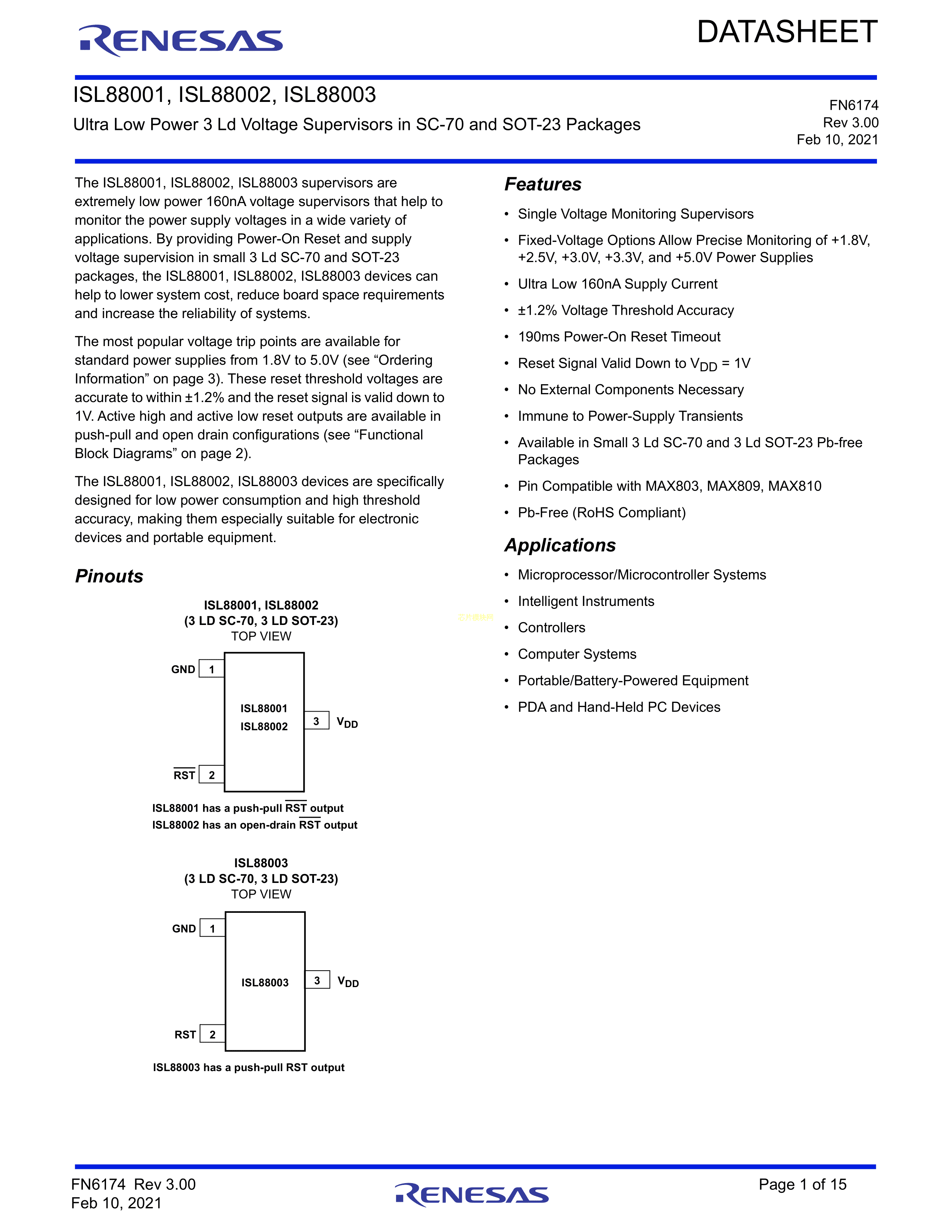 ISL88003IE29Z-T数据手册SC-70-3封装RENESAS(瑞萨)-IDTPDF规格书,