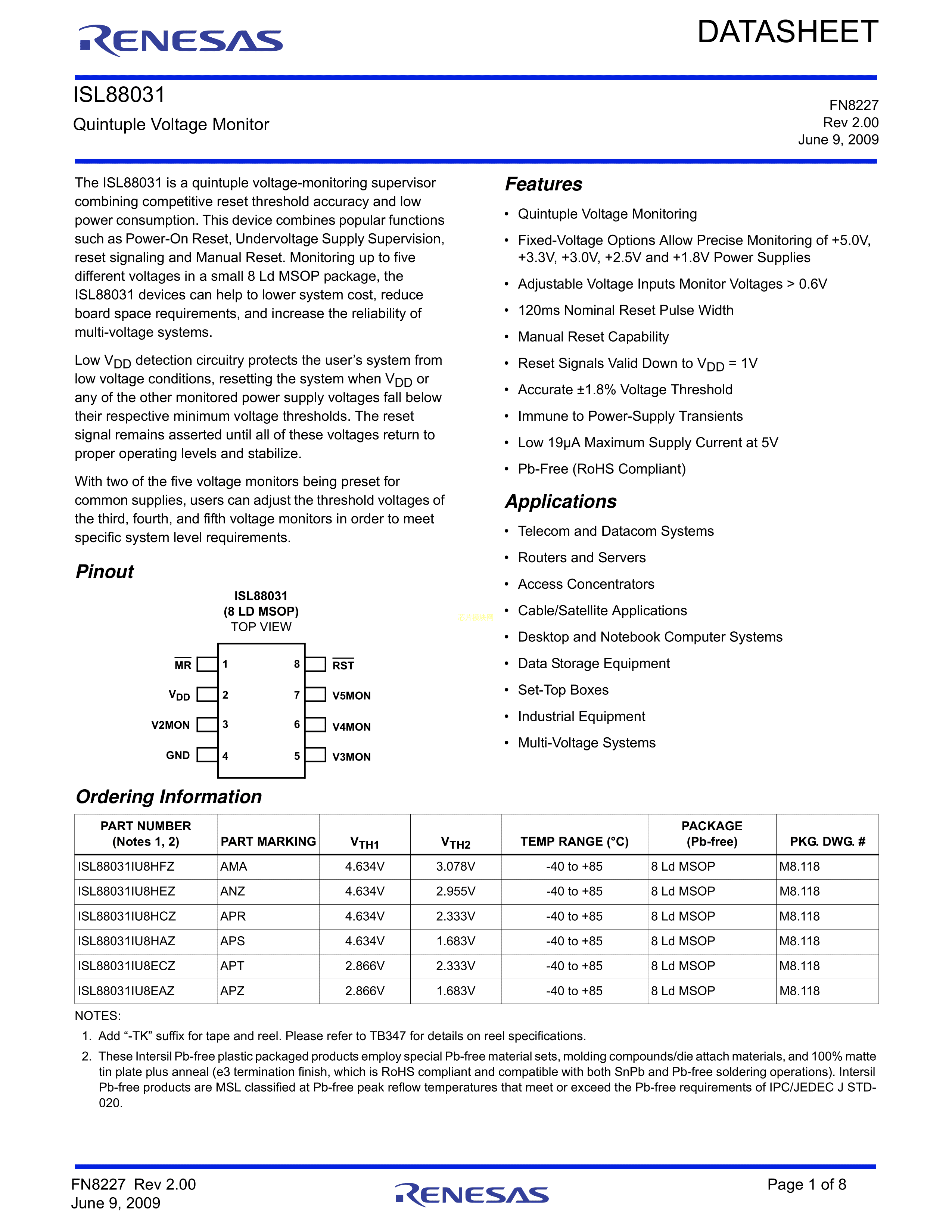 ISL88031IU8HEZ-TK数据手册MSOP-8封装RENESAS(瑞萨)-IDTPDF规格书
