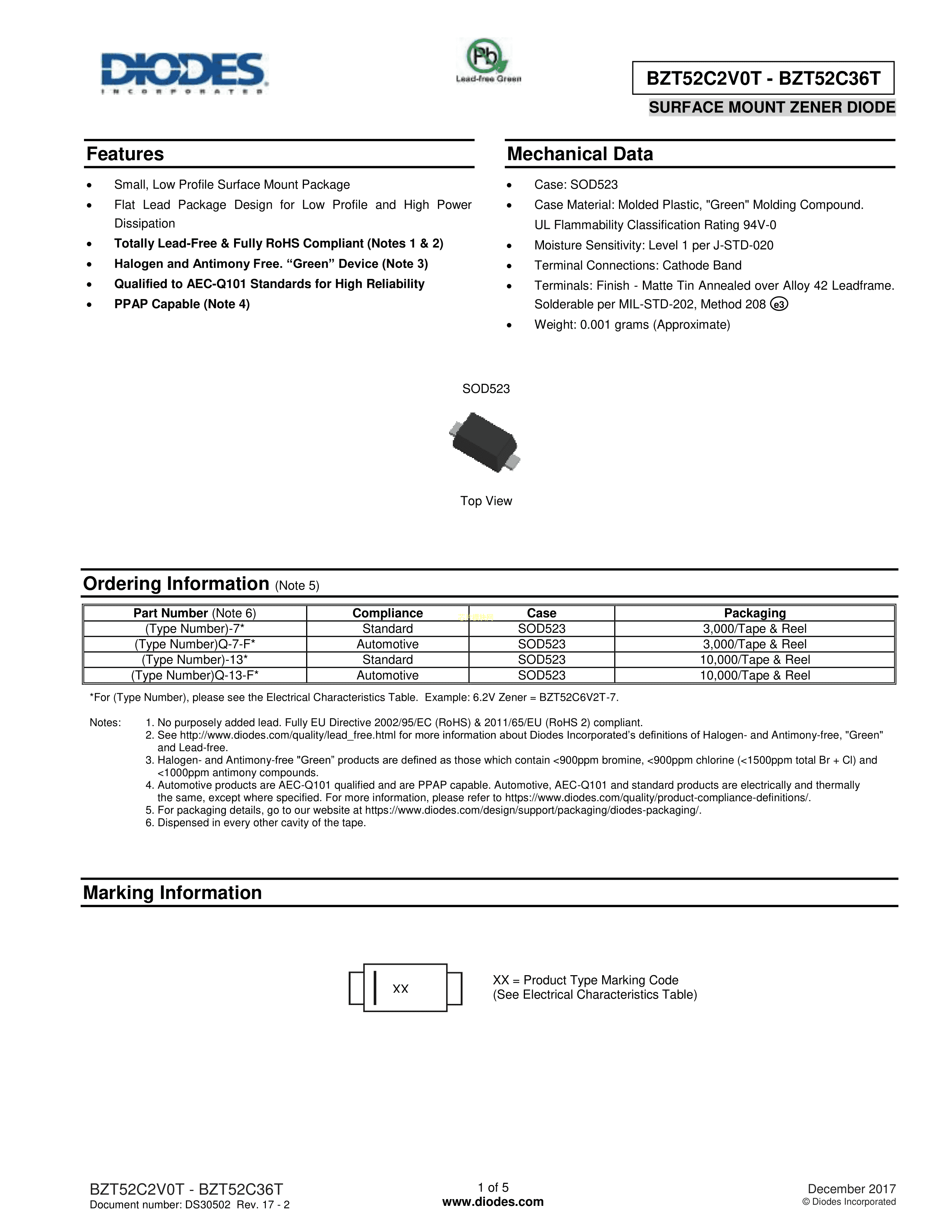 BZT52C11T-7数据手册SOD-523封装DIODES(美台)PDF规格书,中英文下载