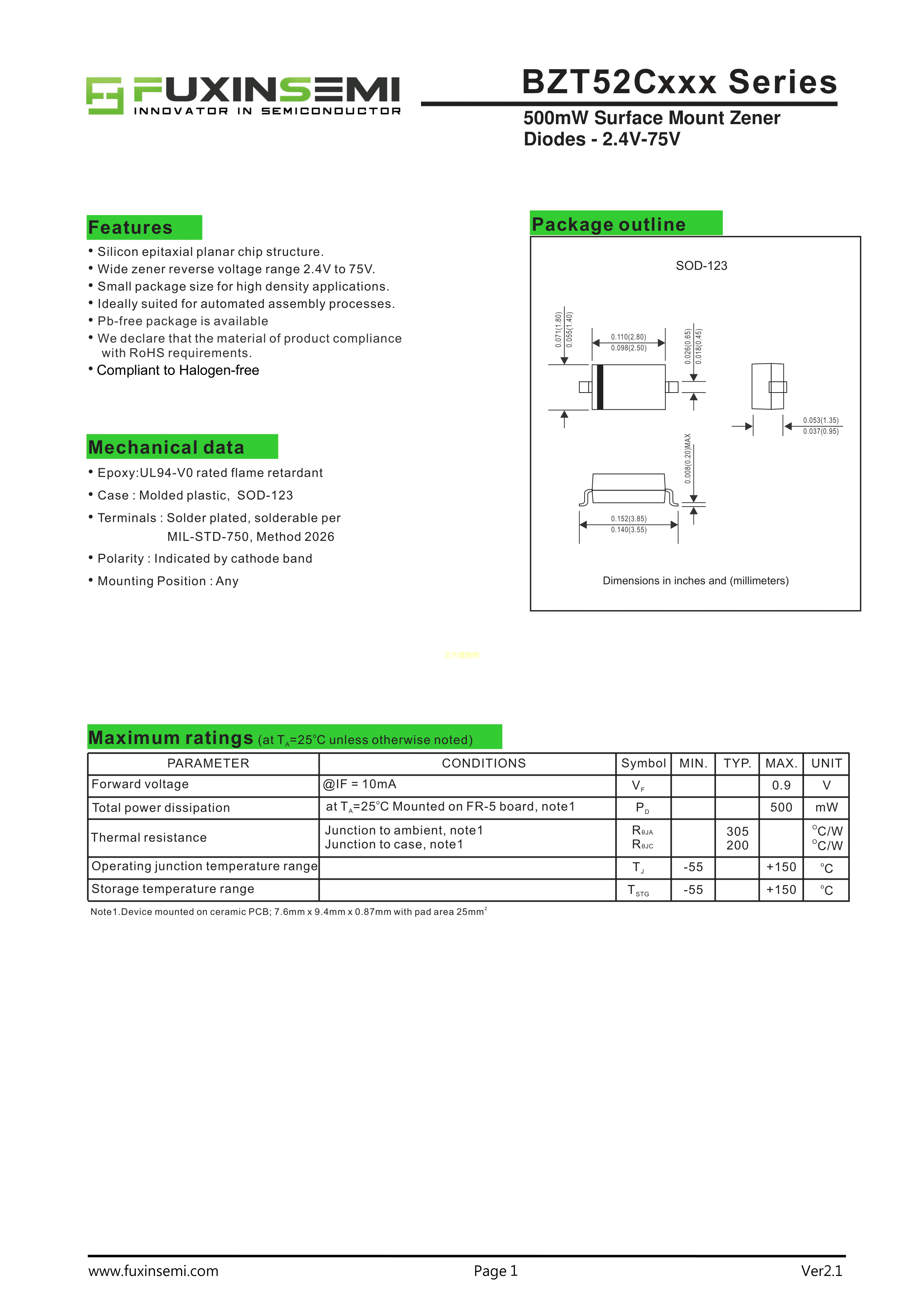 BZT52C12数据手册SOD-123封装FUXINSEMI(富芯森美)PDF规格书,中英文下载