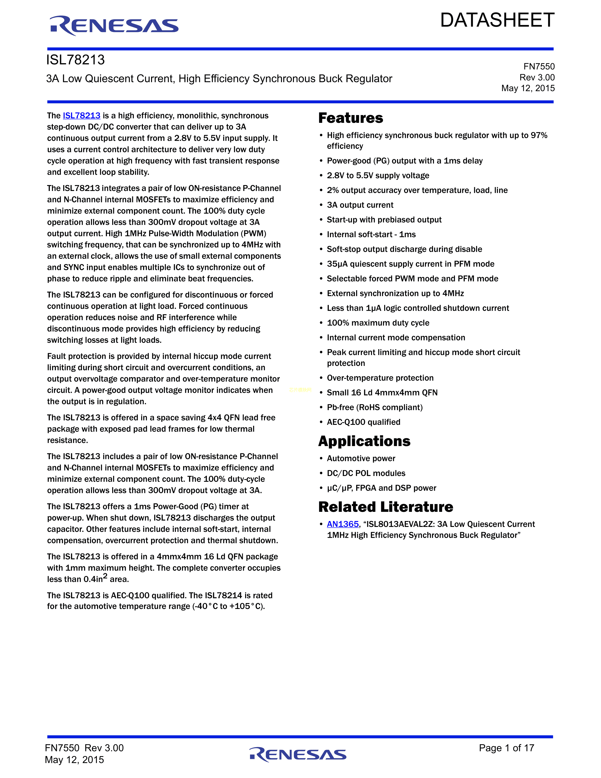ISL78213ARZ数据手册QFN-16(4x4)封装RENESAS(瑞萨)-IDTPDF规格书,