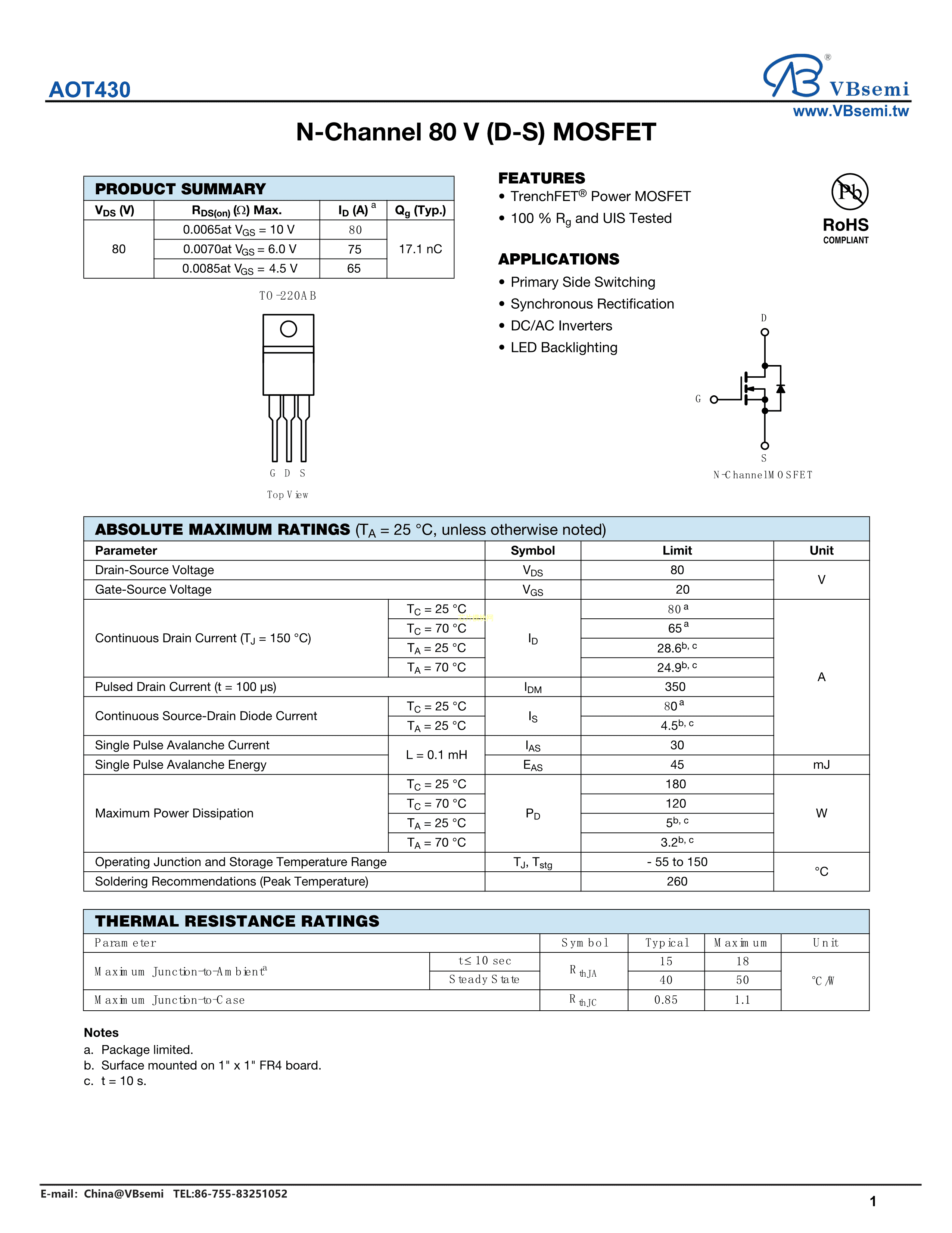AOT430数据手册TO-220AB封装VBsemi(台湾微碧)PDF规格书,中英文下载