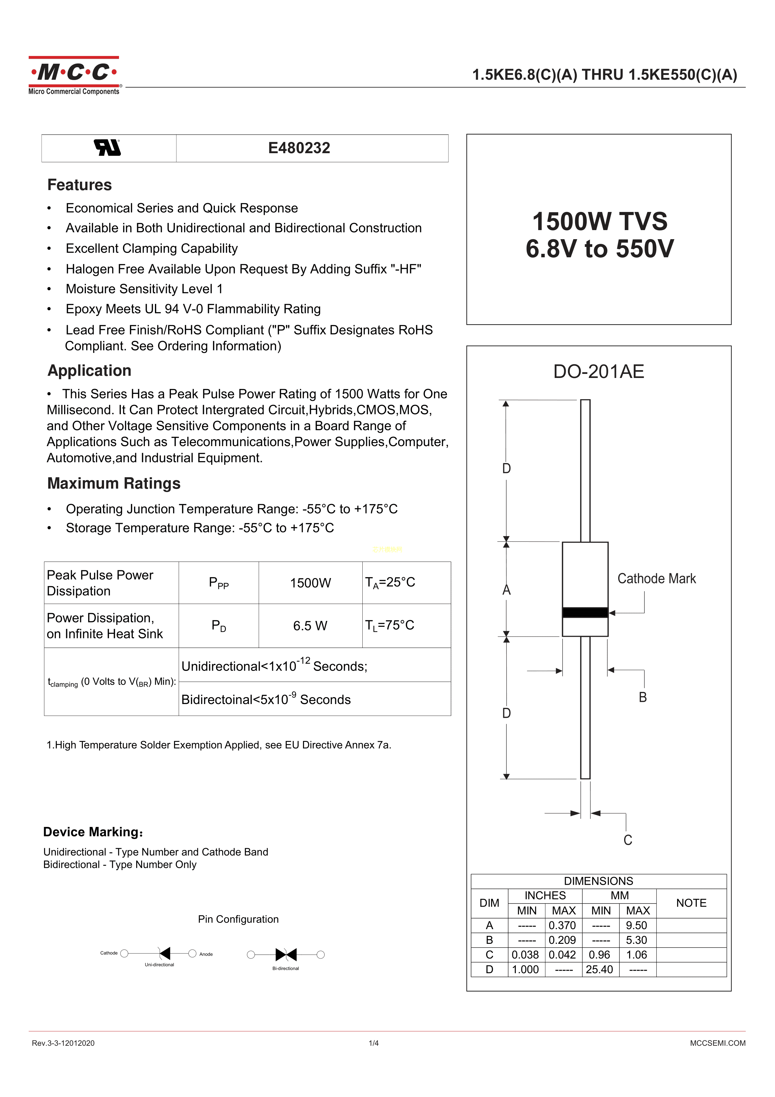 1.5KE30CA-TP数据手册DO-201AE封装MCC(美微科)PDF规格书,中英文下载