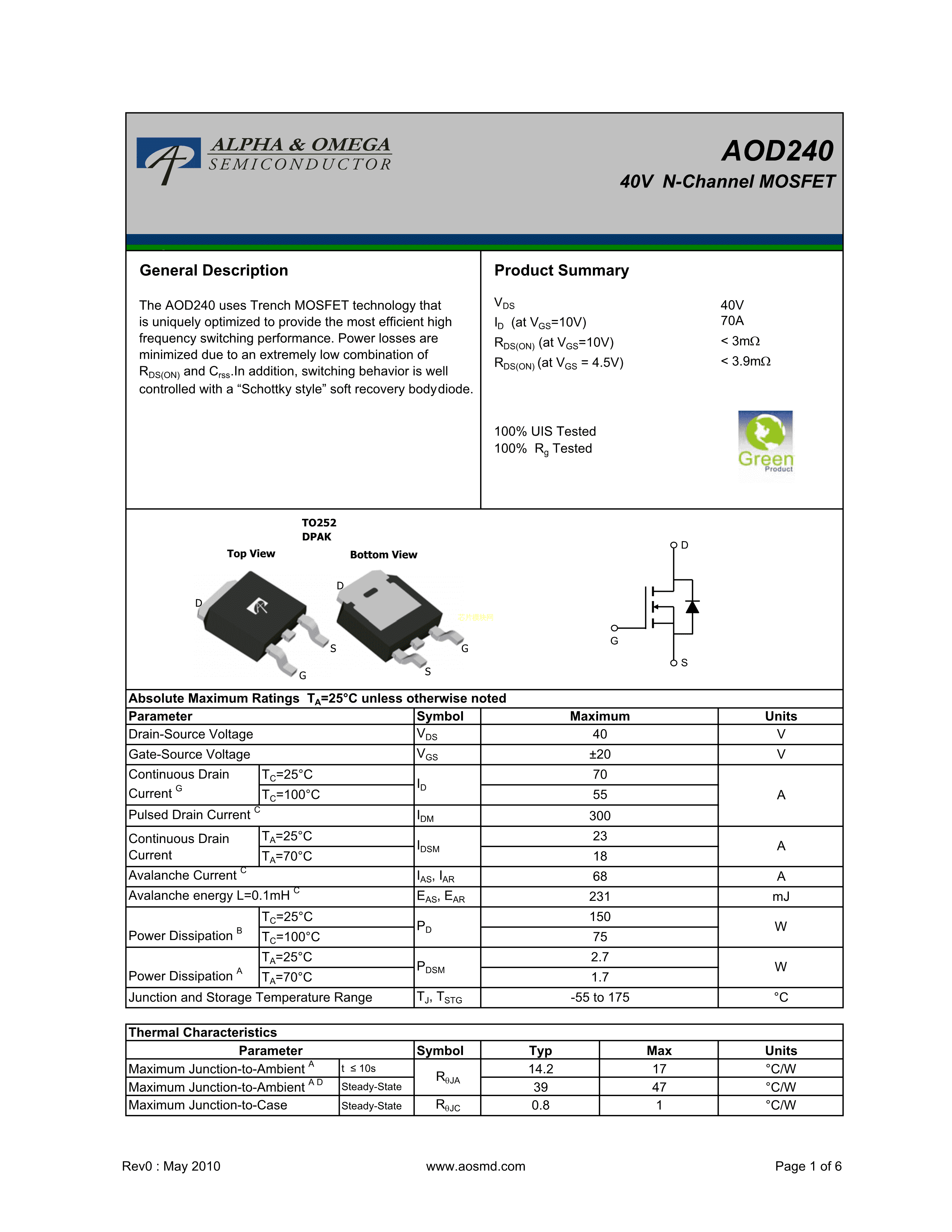 AOD240数据手册TO-252封装AOSPDF规格书,中英文下载