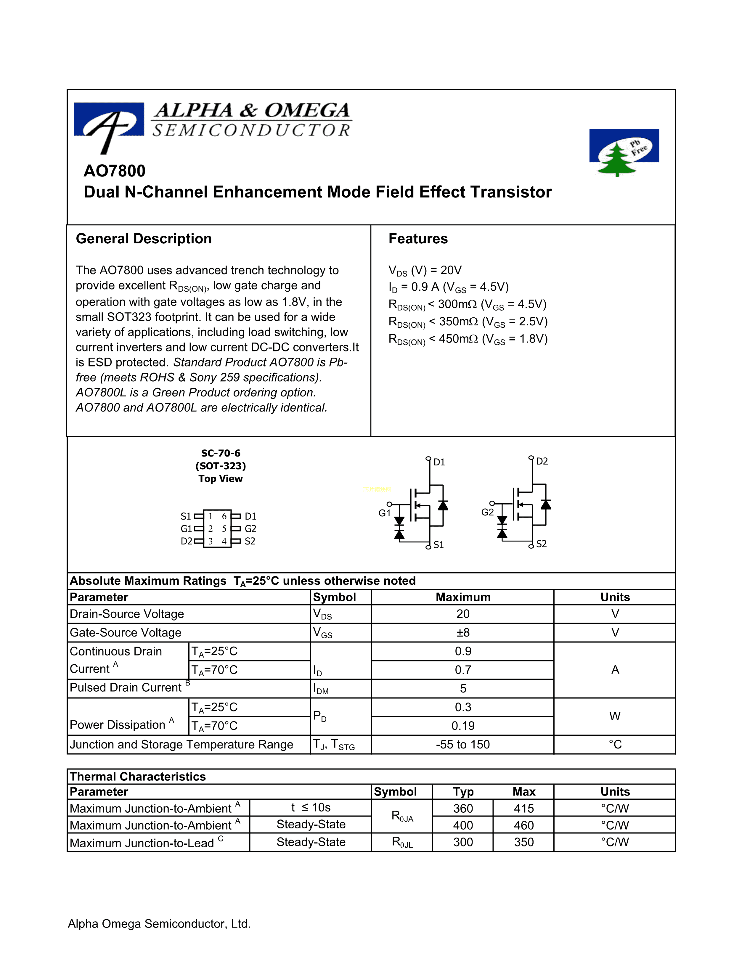 AO7800数据手册SC-70-6(SOT-363)封装AOSPDF规格书,中英文下载