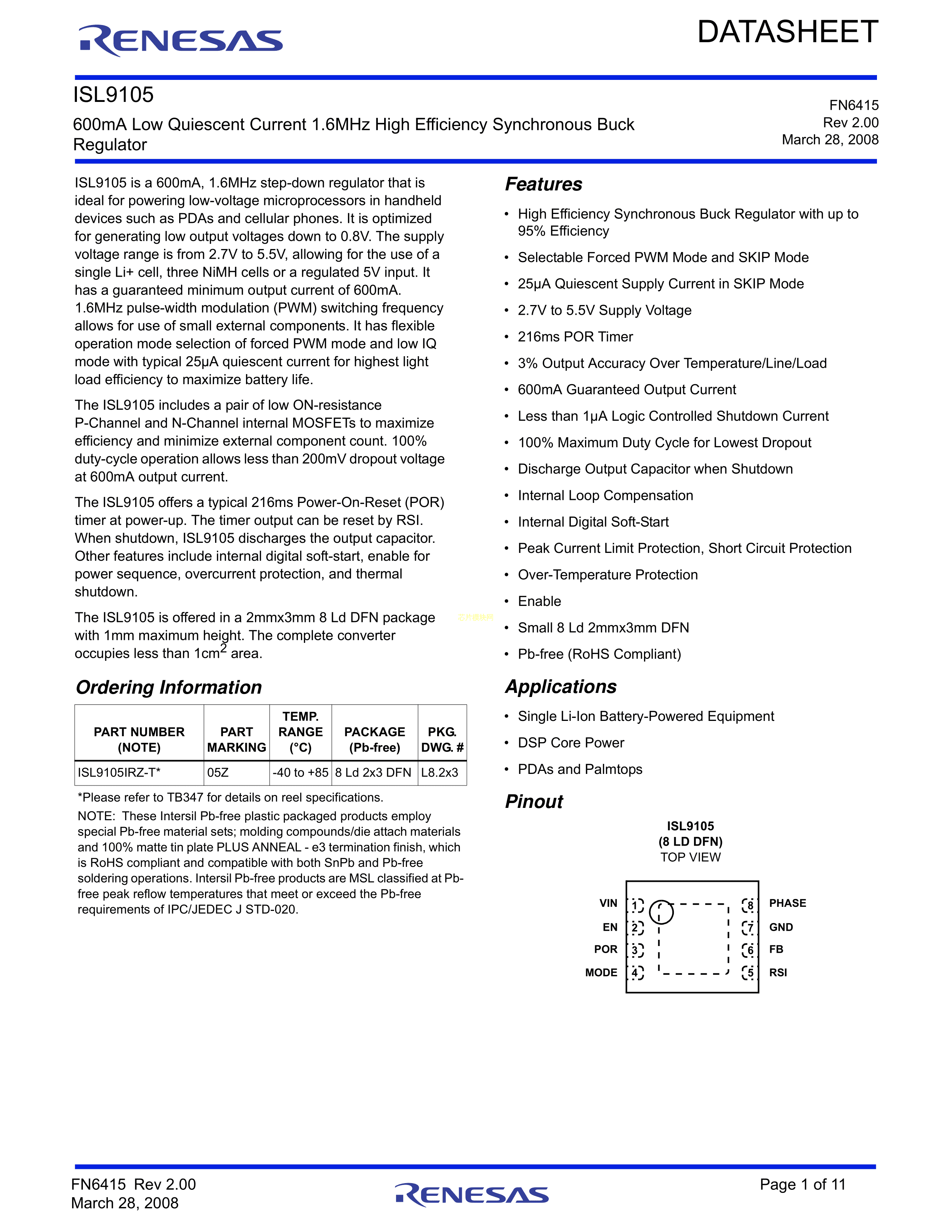 ISL9104AIRUAZ-T7A数据手册UTDFN-6(1.6x1.6)封装RENESAS(瑞萨)
