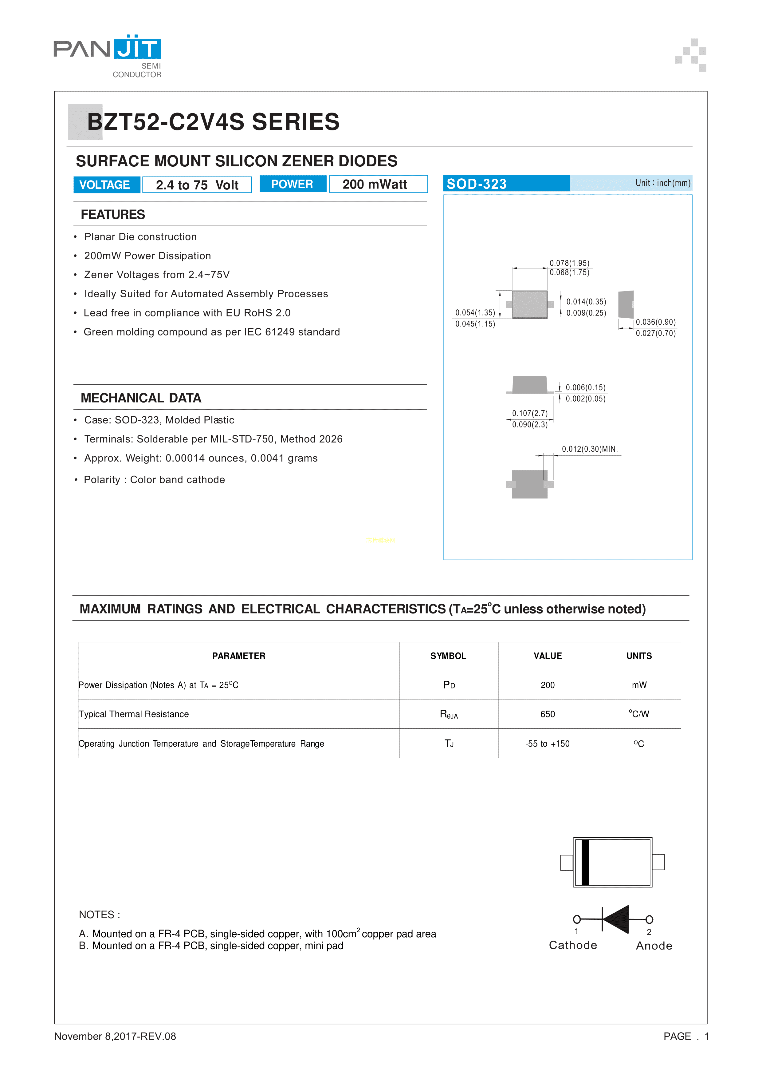 BZT52-C7V5S_R1_000A2数据手册SOD-323封装PANJIT(强茂)PDF规格书,