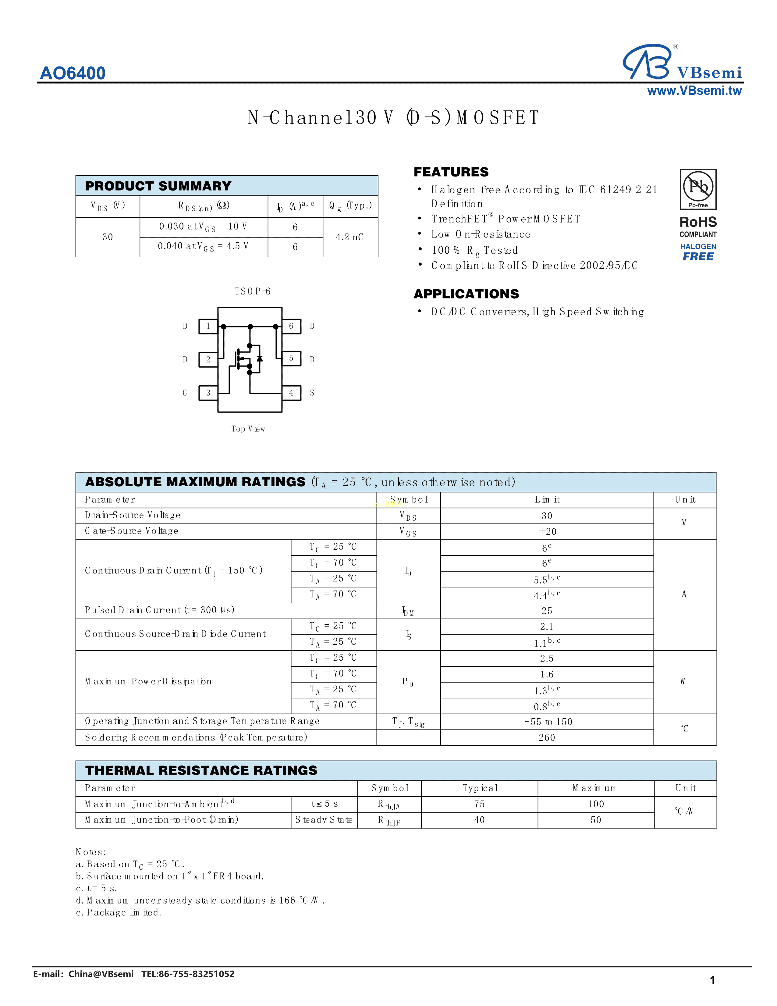 AO6400数据手册TSOP-6封装VBsemi(台湾微碧)PDF规格书,中英文下载