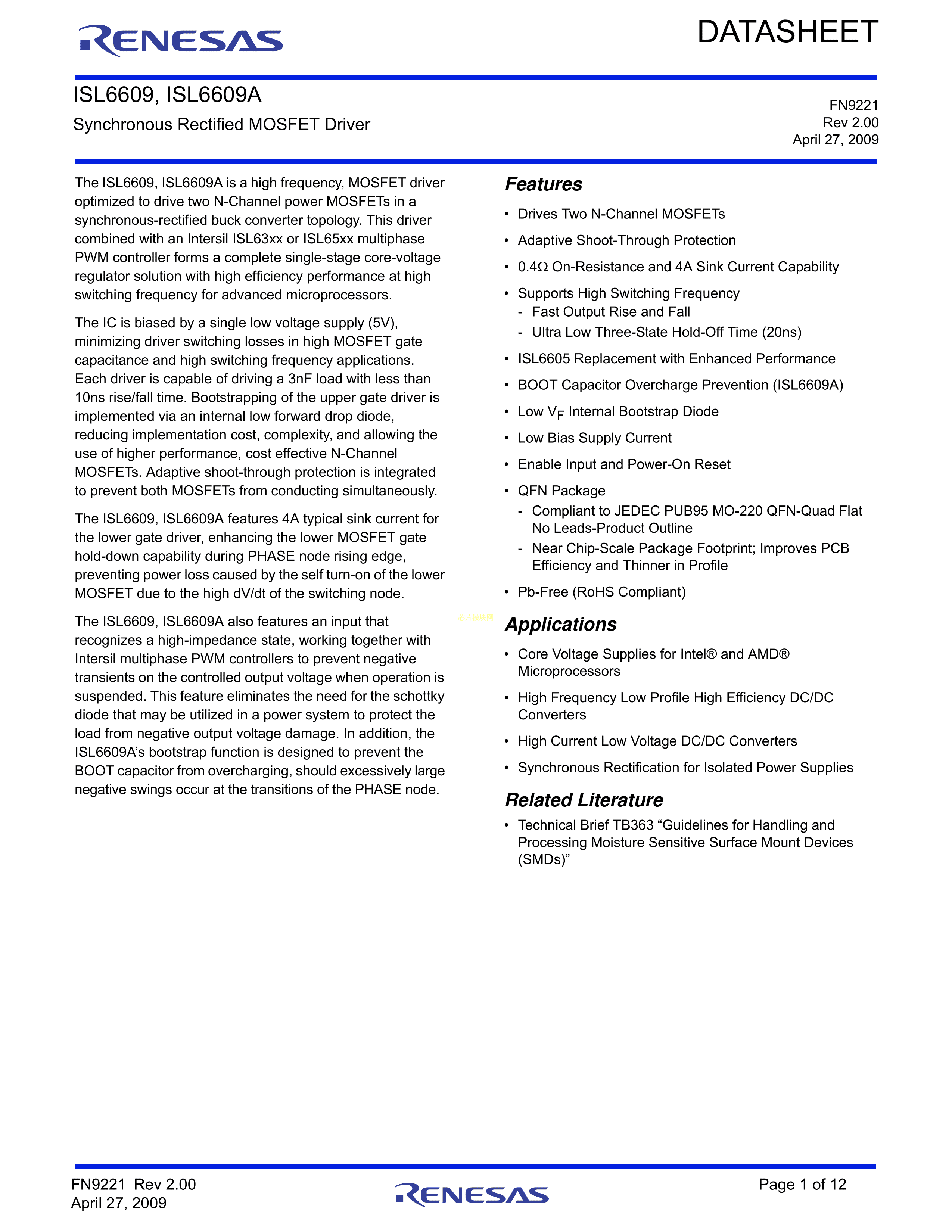 ISL6609IRZ-T数据手册QFN-8(3x3)封装RENESAS(瑞萨)-IDTPDF规格书,