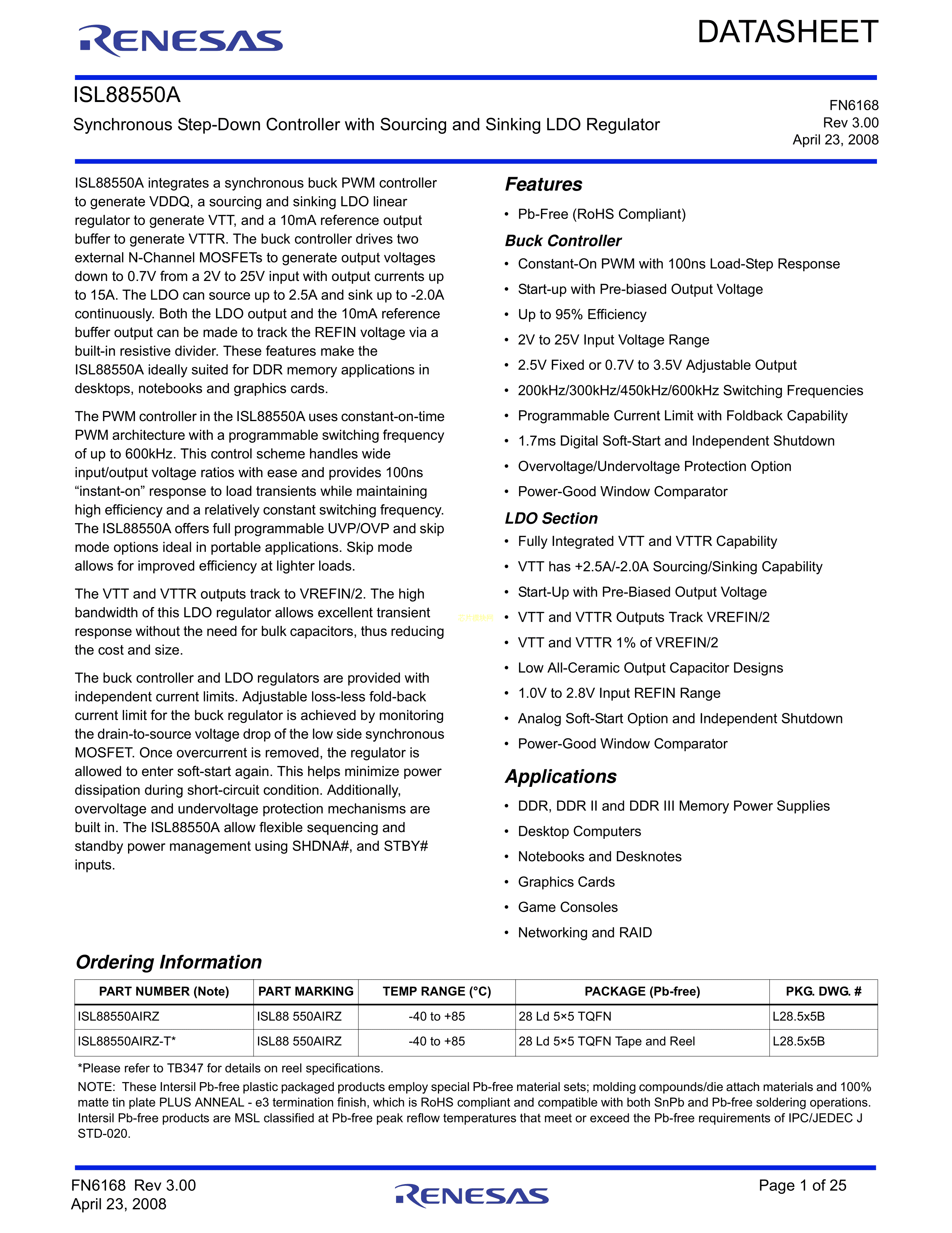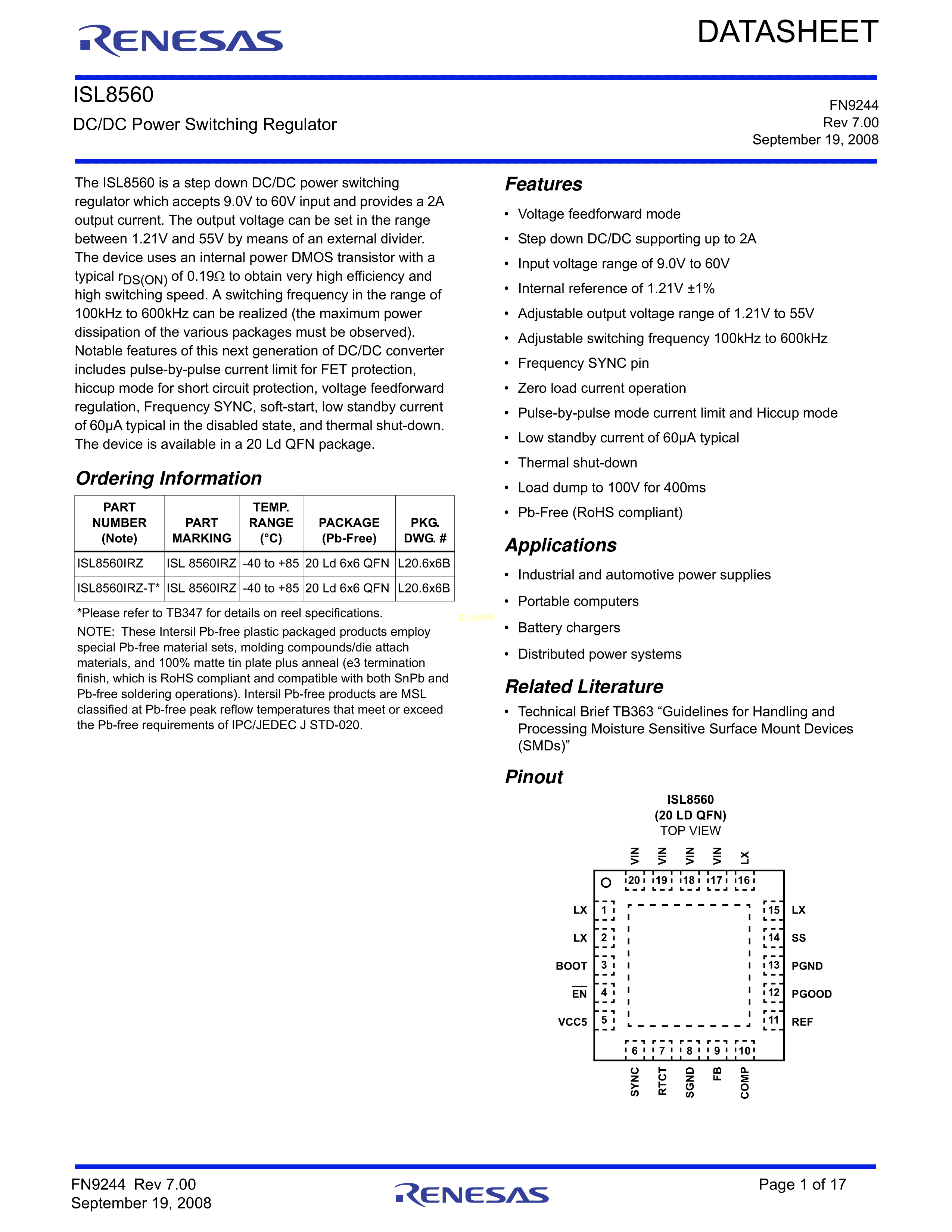 ISL8560IRZ数据手册QFN-20(6x6)封装RENESAS(瑞萨)-IDTPDF规格书,中