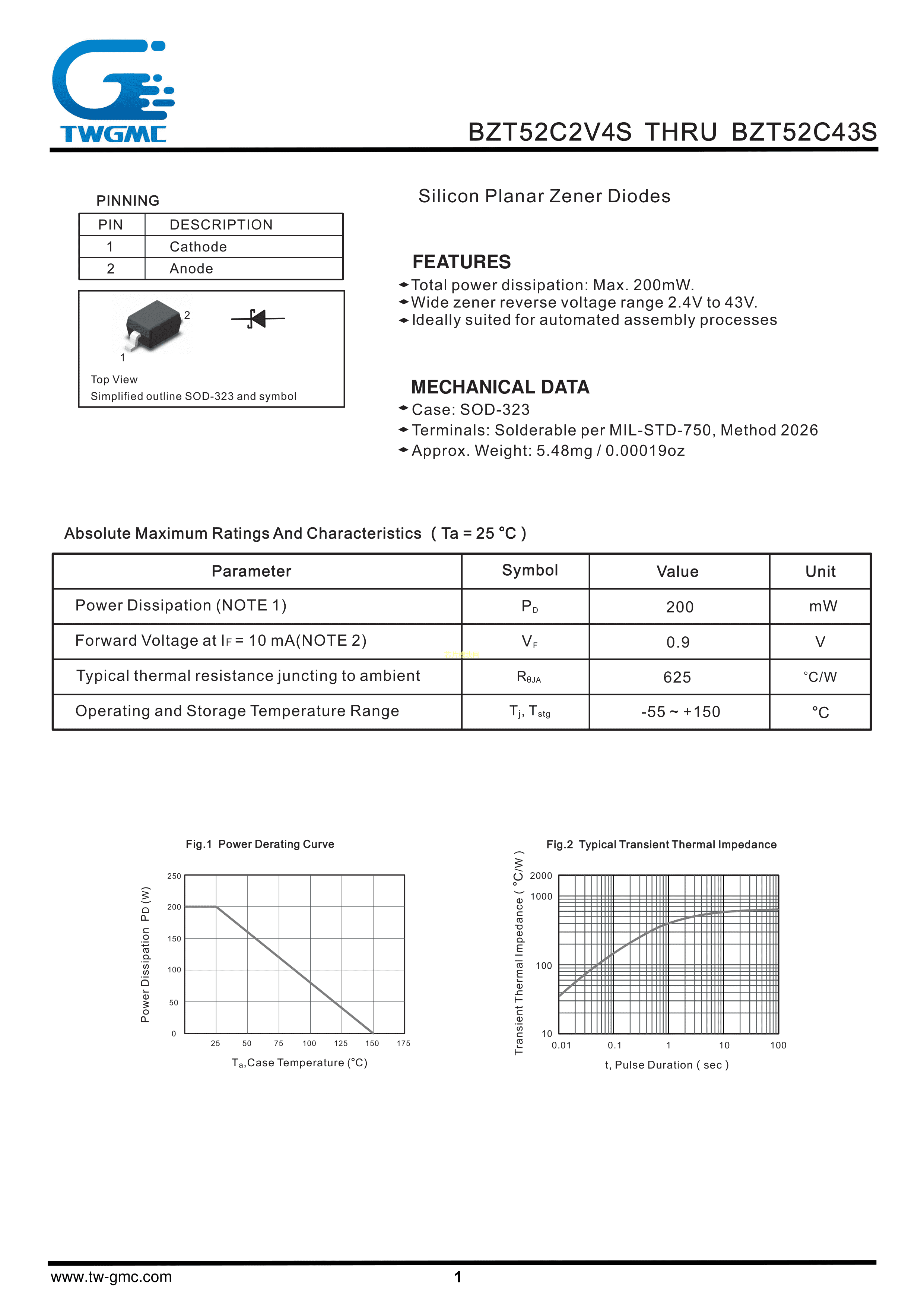 BZT52C6V8S数据手册SOD-323封装TWGMC(台湾迪嘉)PDF规格书,中英文下载