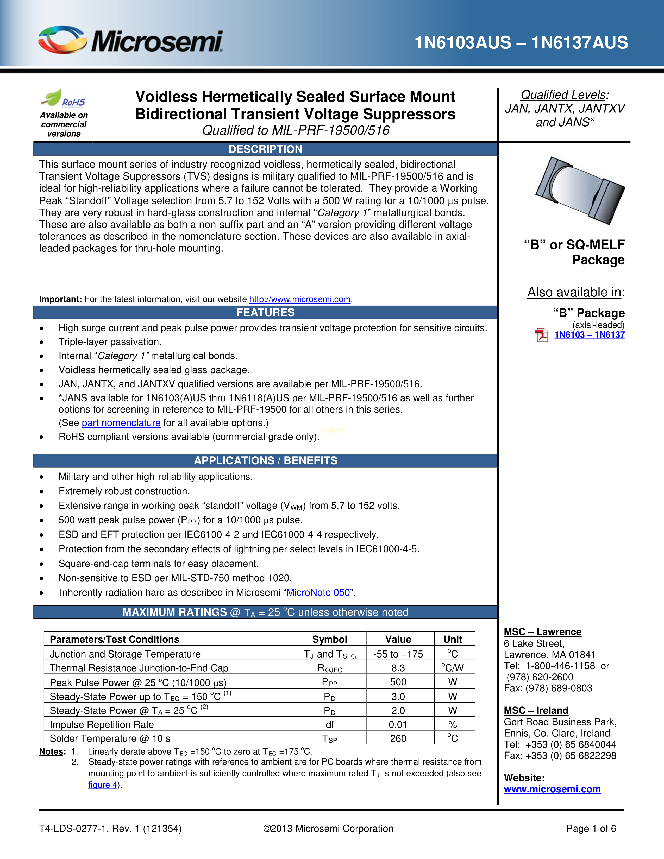 1N6121US数据手册-封装Microsemi(美高森美)PDF规格书,中英文下载