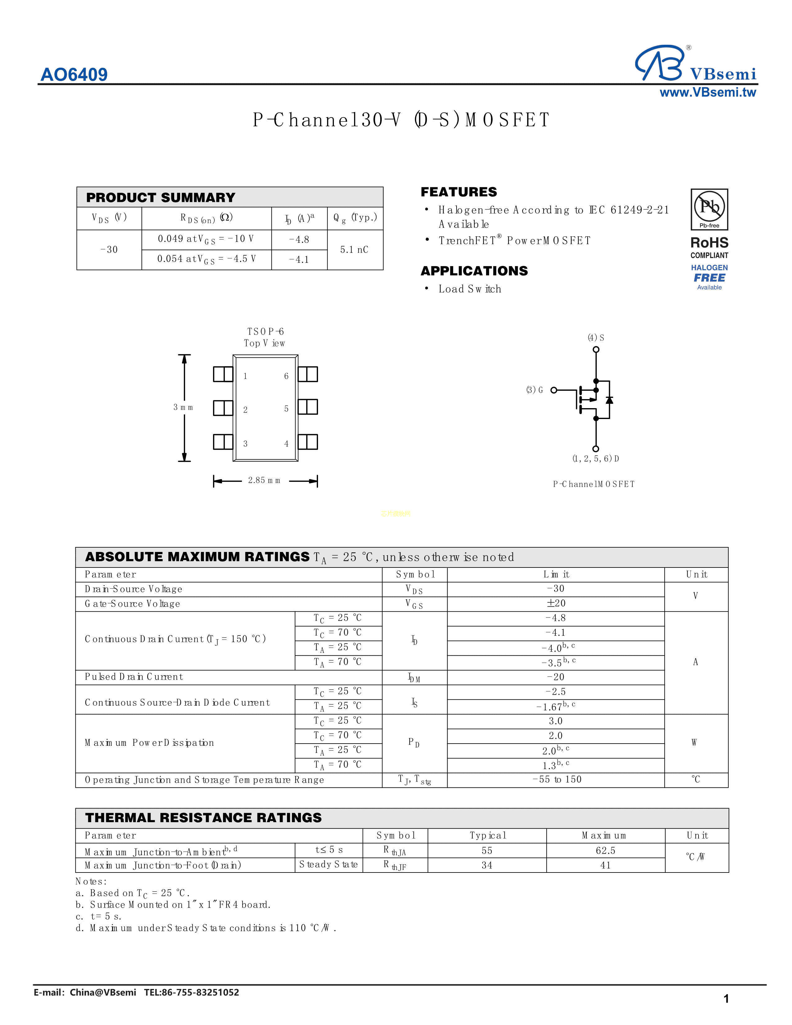 AO6409数据手册SOT-23-6封装VBsemi(台湾微碧)PDF规格书,中英文下载