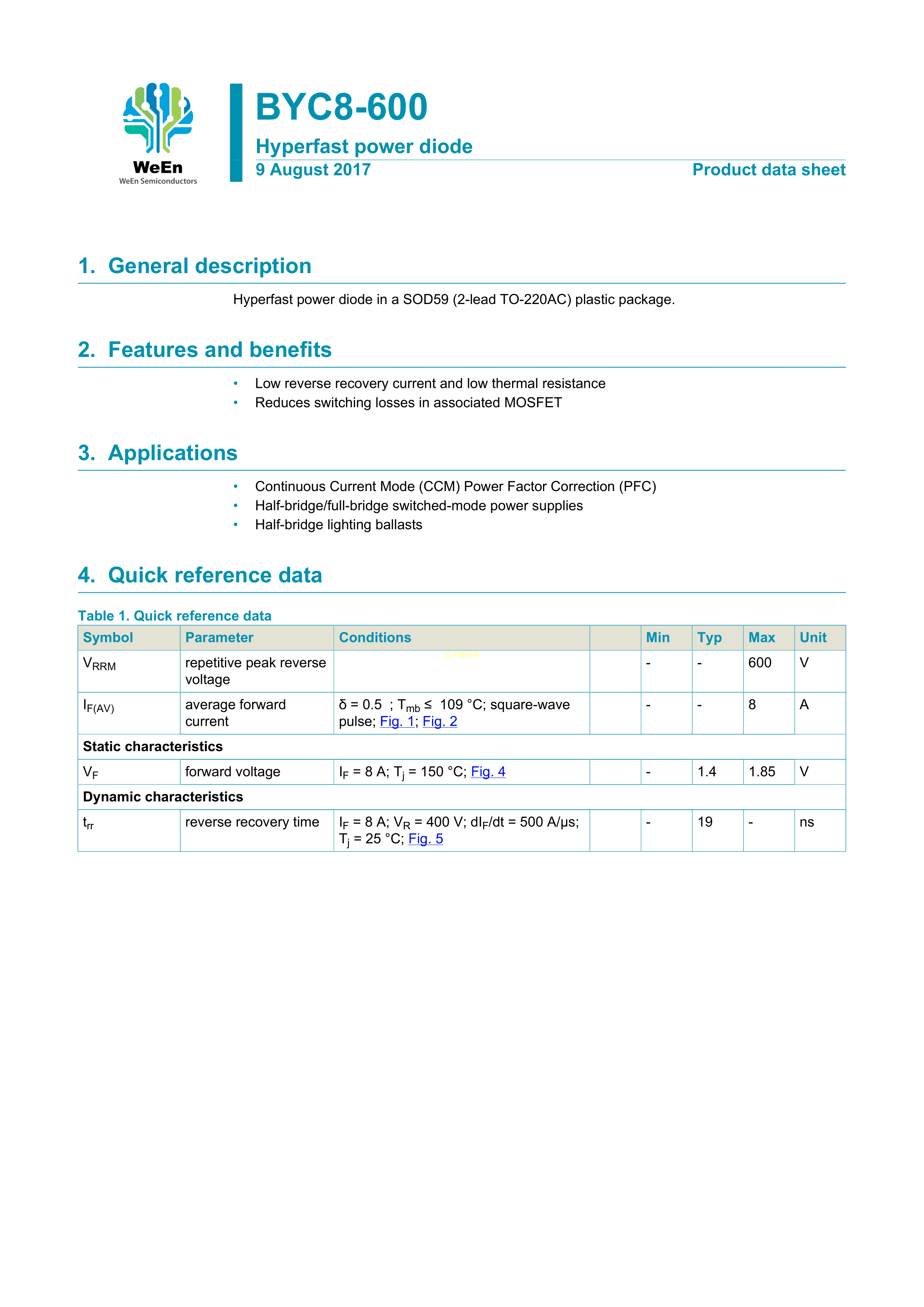 BYC8-600127数据手册SOD-59封装WeEn(瑞能)PDF规格书,中英文下载
