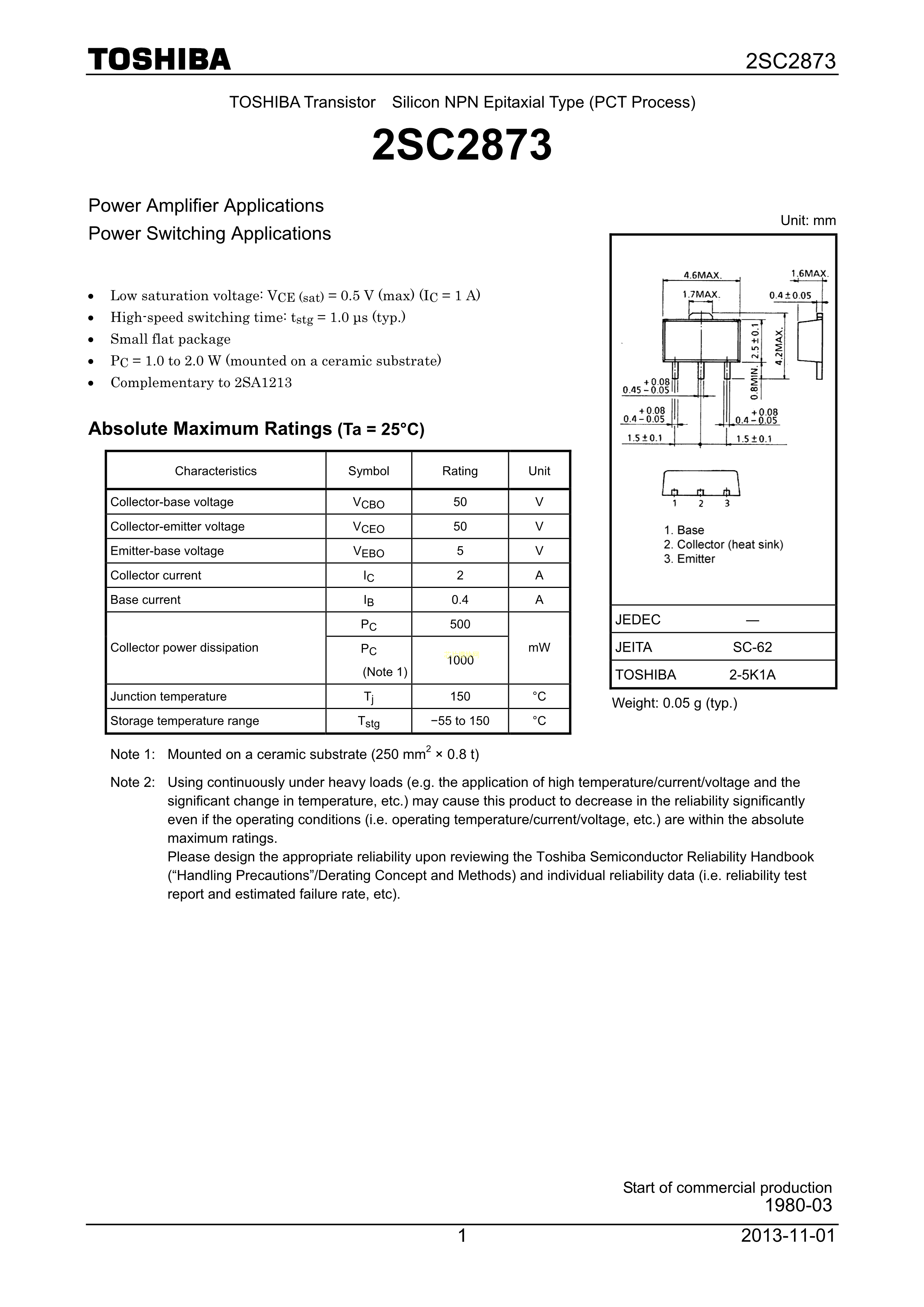 2SC2873-Y(TE12LZC数据手册SC-62封装TOSHIBA(东芝)PDF规格书,中英文下