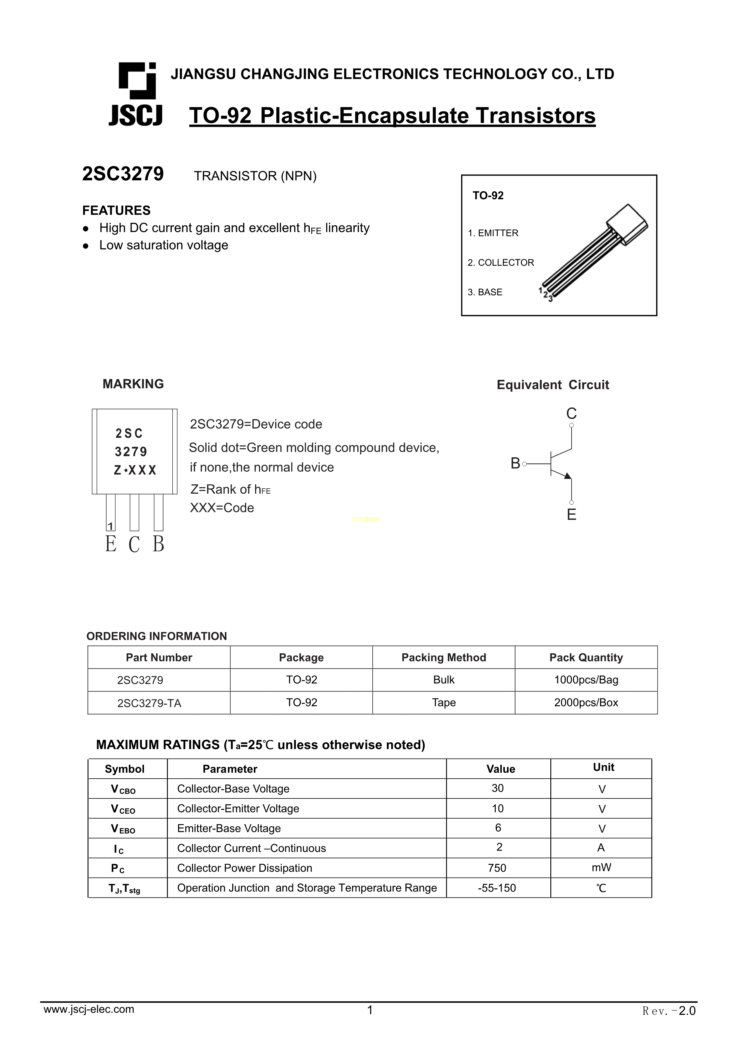 2SC3279数据手册TO-92封装CJ(江苏长电-长晶)PDF规格书,中英文下载