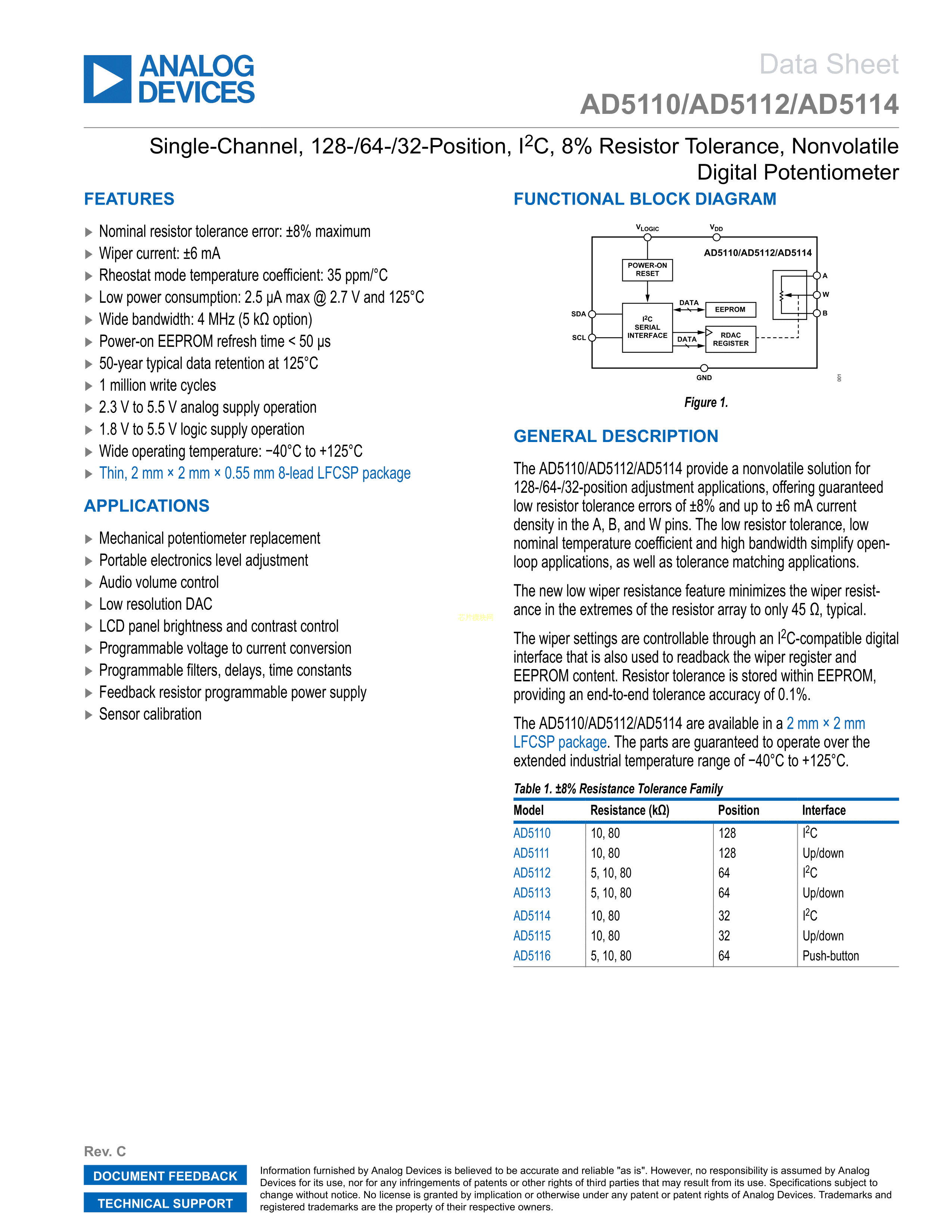 AD5112BCPZ5-RL7数据手册LFCSP-8封装ADI(亚德诺)-LINEARPDF规格书,