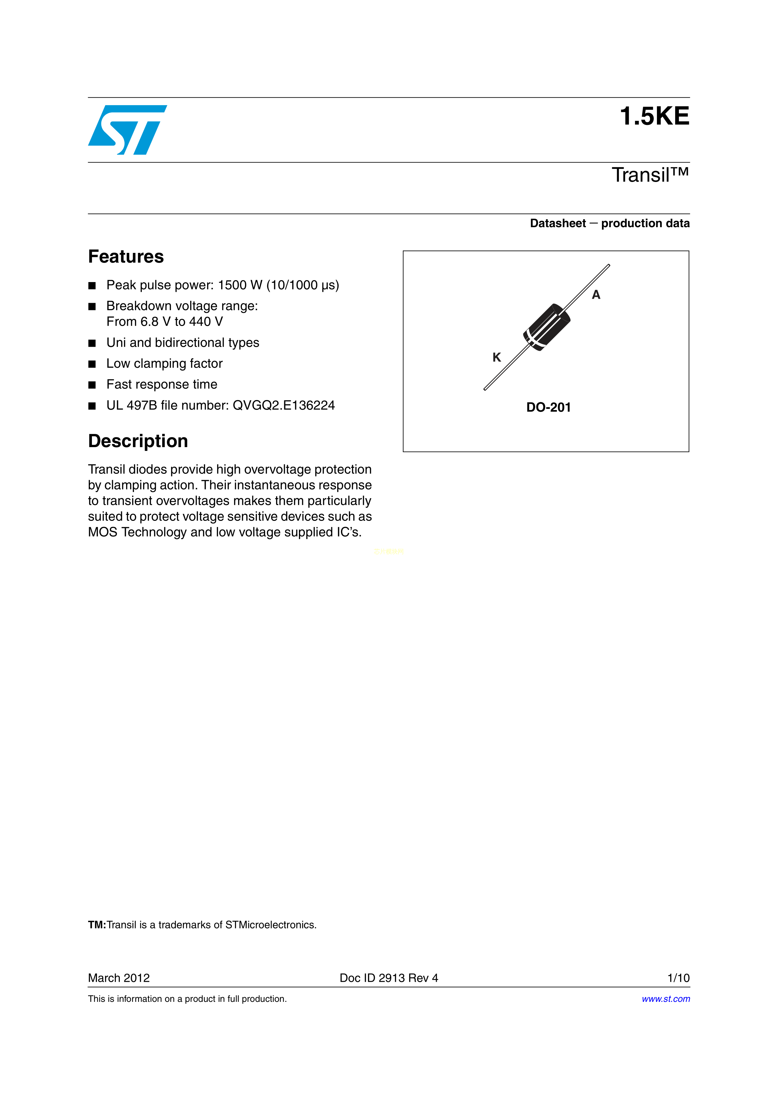 1.5KE30CA数据手册DO-201封装ST(意法半导体)PDF规格书,中英文下载