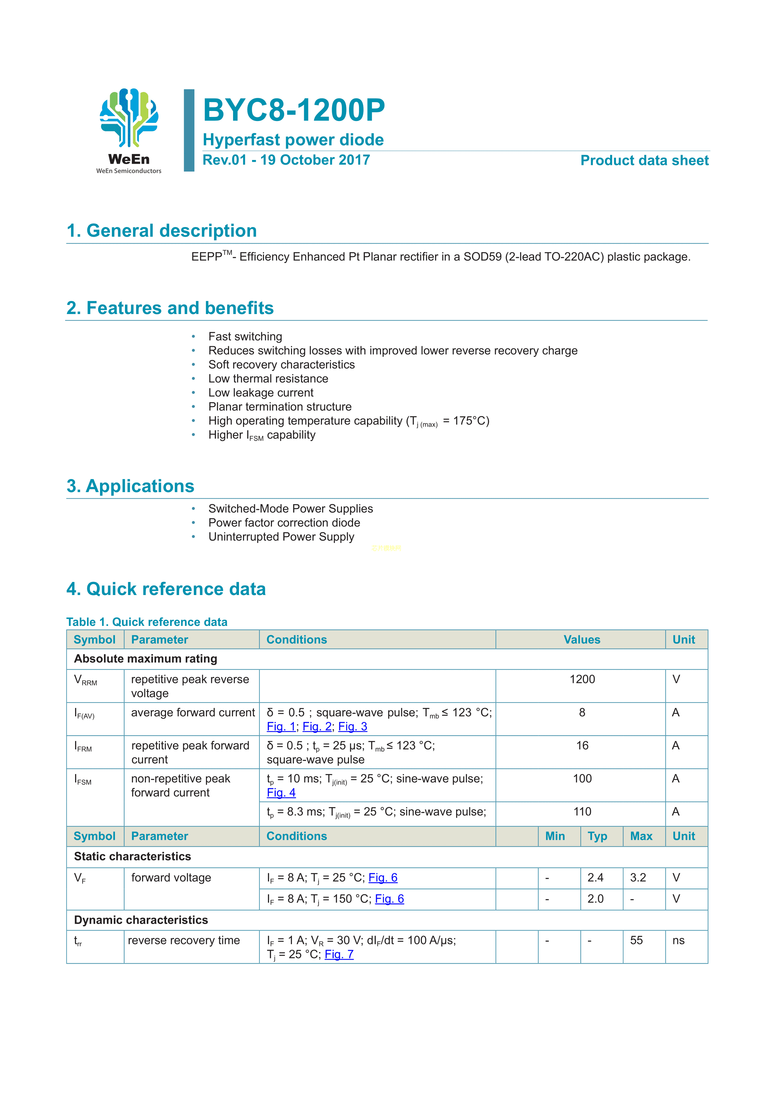 BYC8-1200PQ数据手册TO-220封装WeEn(瑞能)PDF规格书,中英文下载