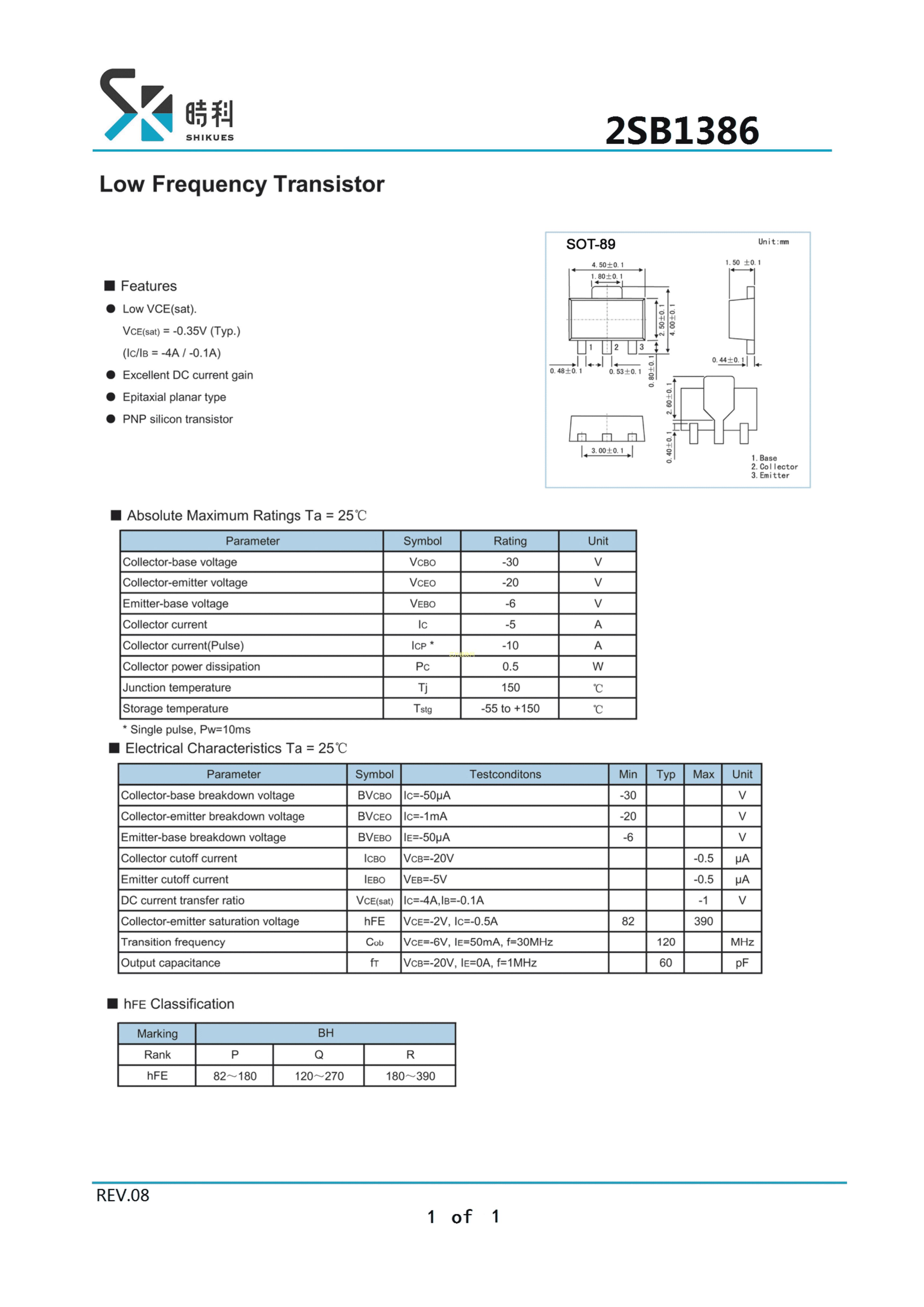 2SB1386R数据手册SOT-89封装SHIKUES(时科)PDF规格书,中英文下载