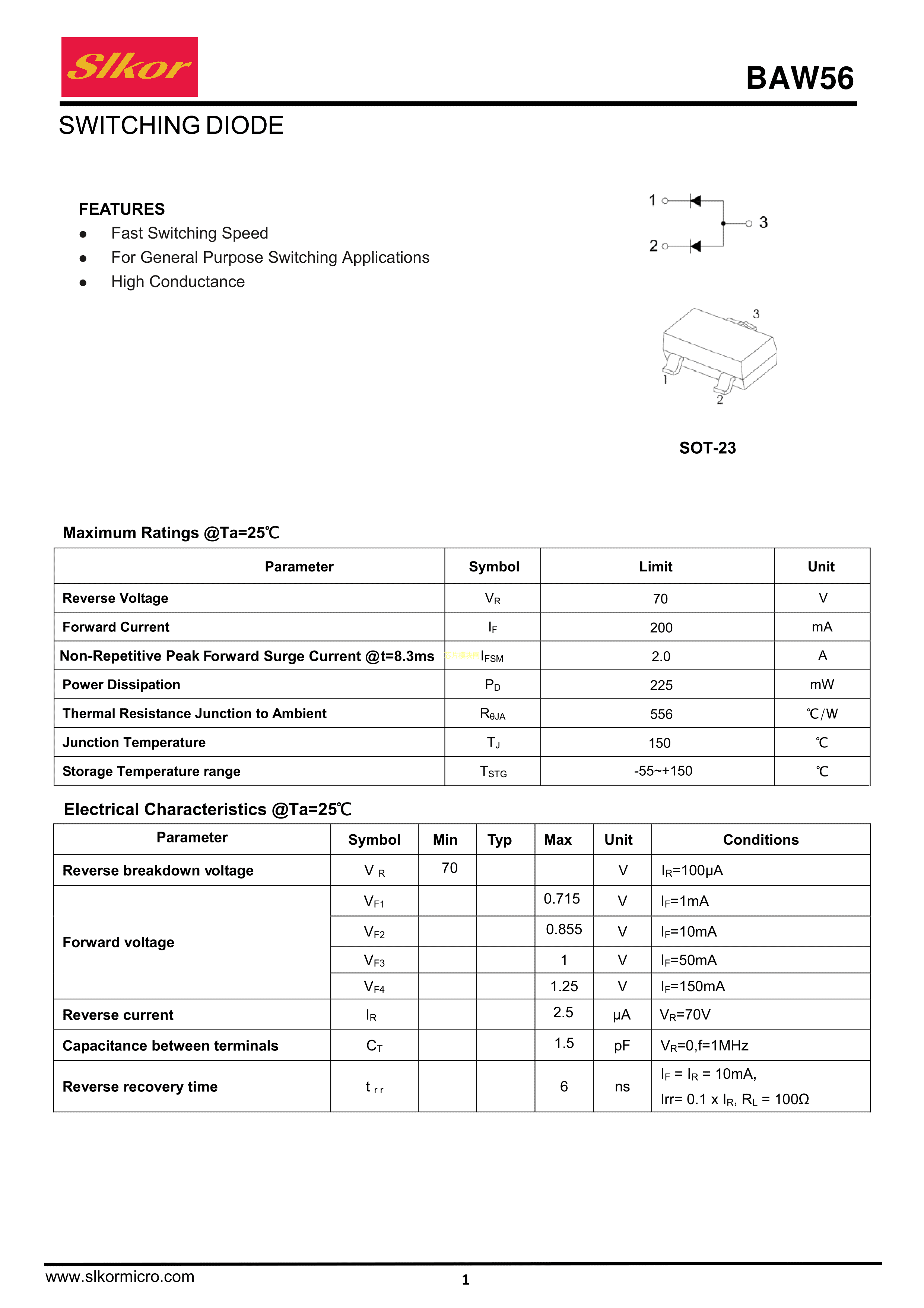 BAW56数据手册SOT-23封装Slkor(萨科微)PDF规格书,中英文下载