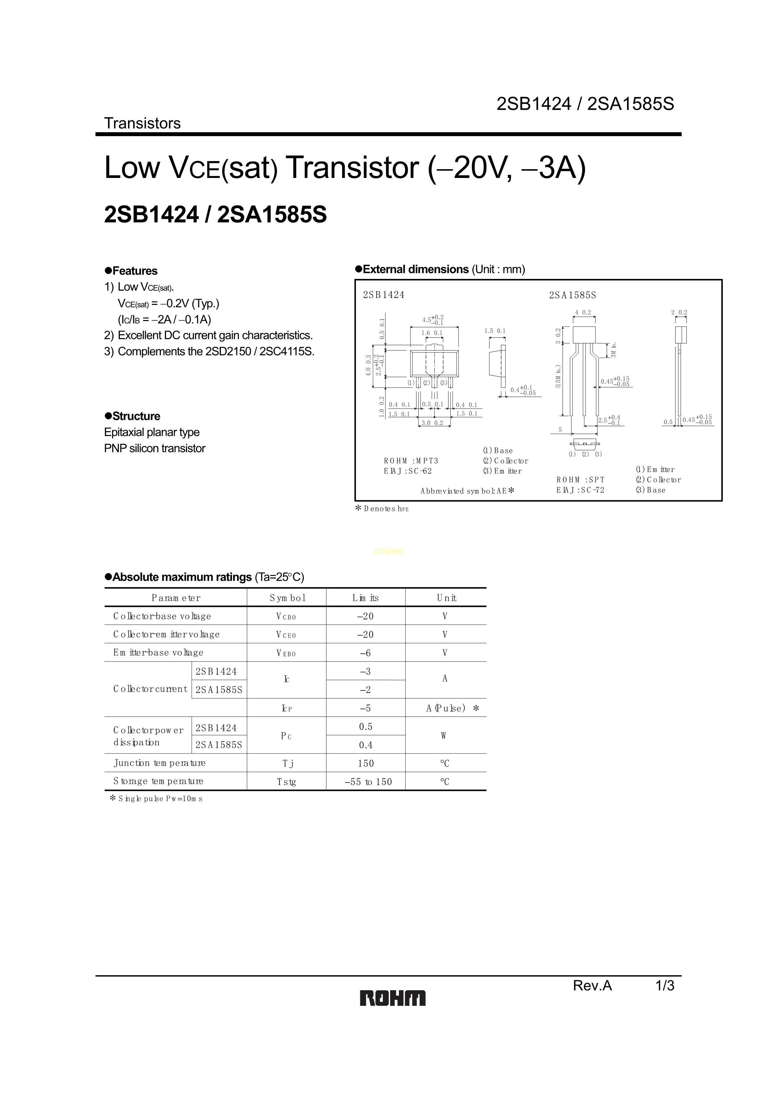 2SB1424T100Q数据手册MPT3封装ROHM(罗姆)PDF规格书,中英文下载