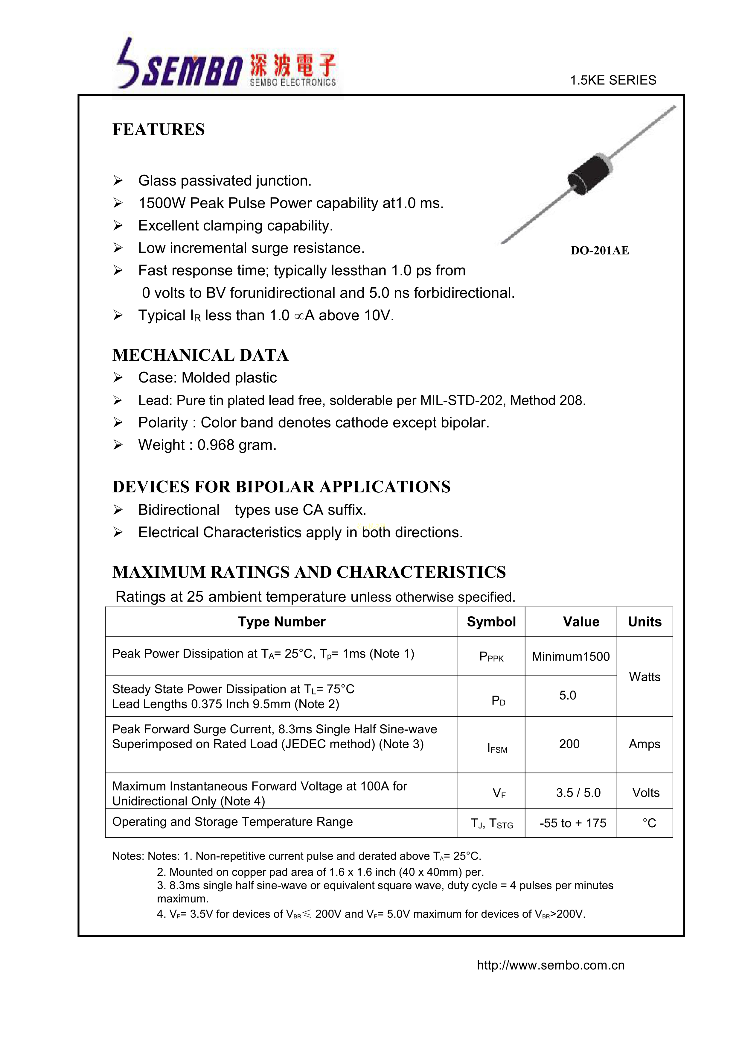 1.5KE15CA数据手册DO-201AE封装SEMBO(深波)PDF规格书,中英文下载