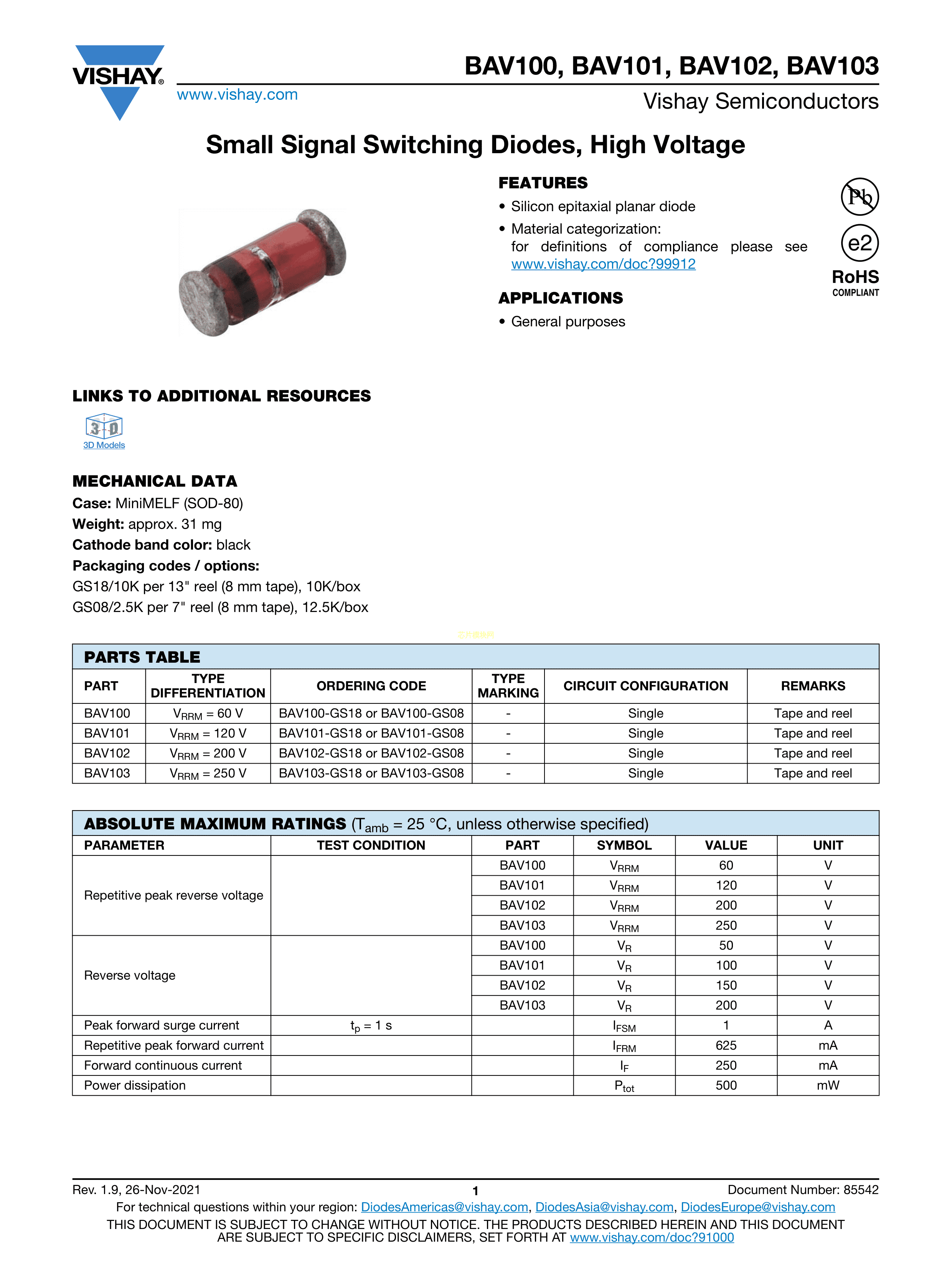 BAV100-GS08数据手册SOD-80封装VISHAY(威世)PDF规格书,中英文下载